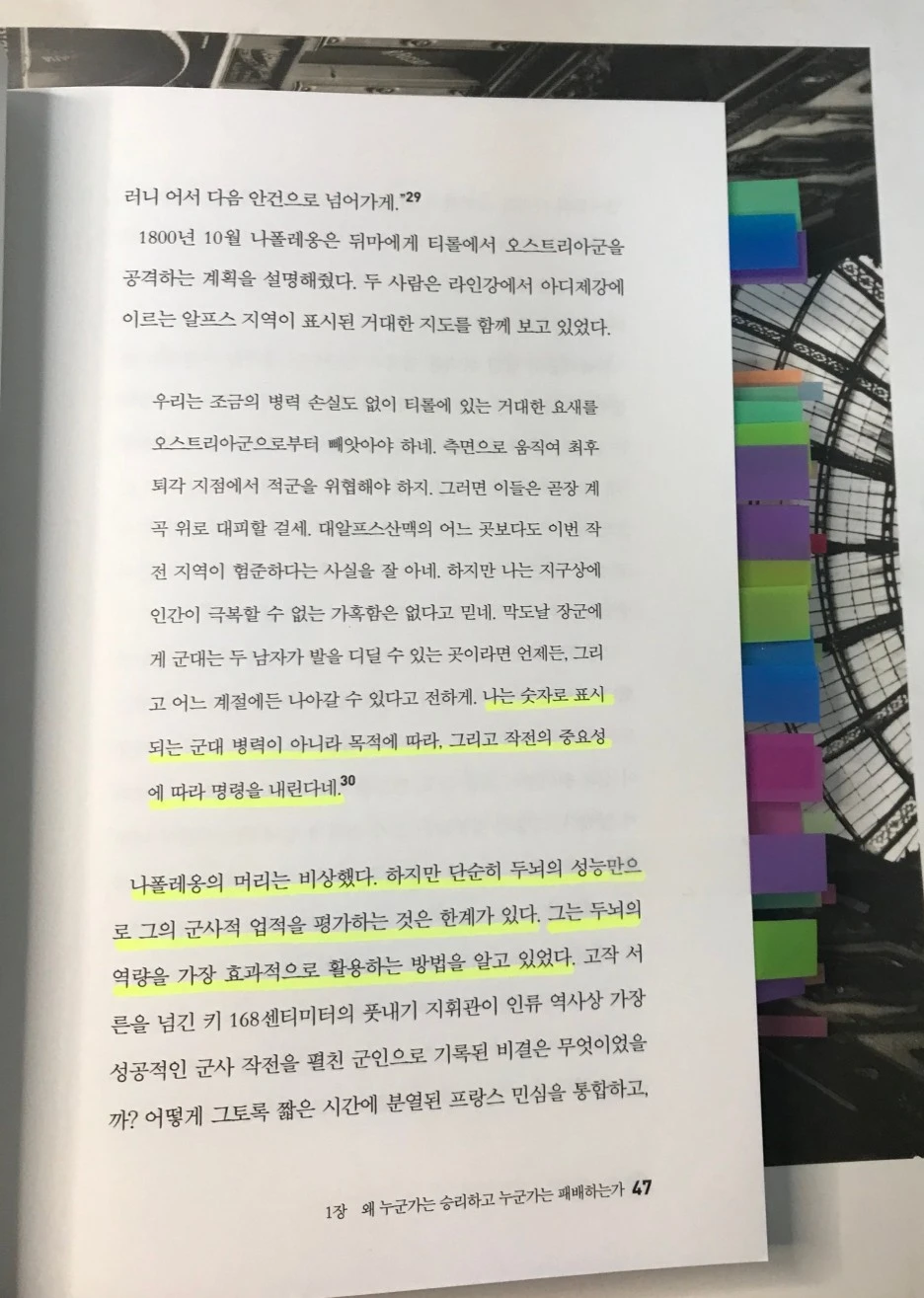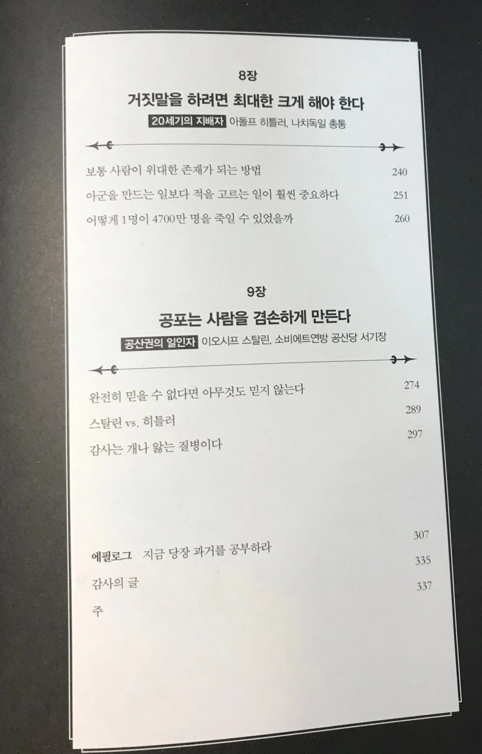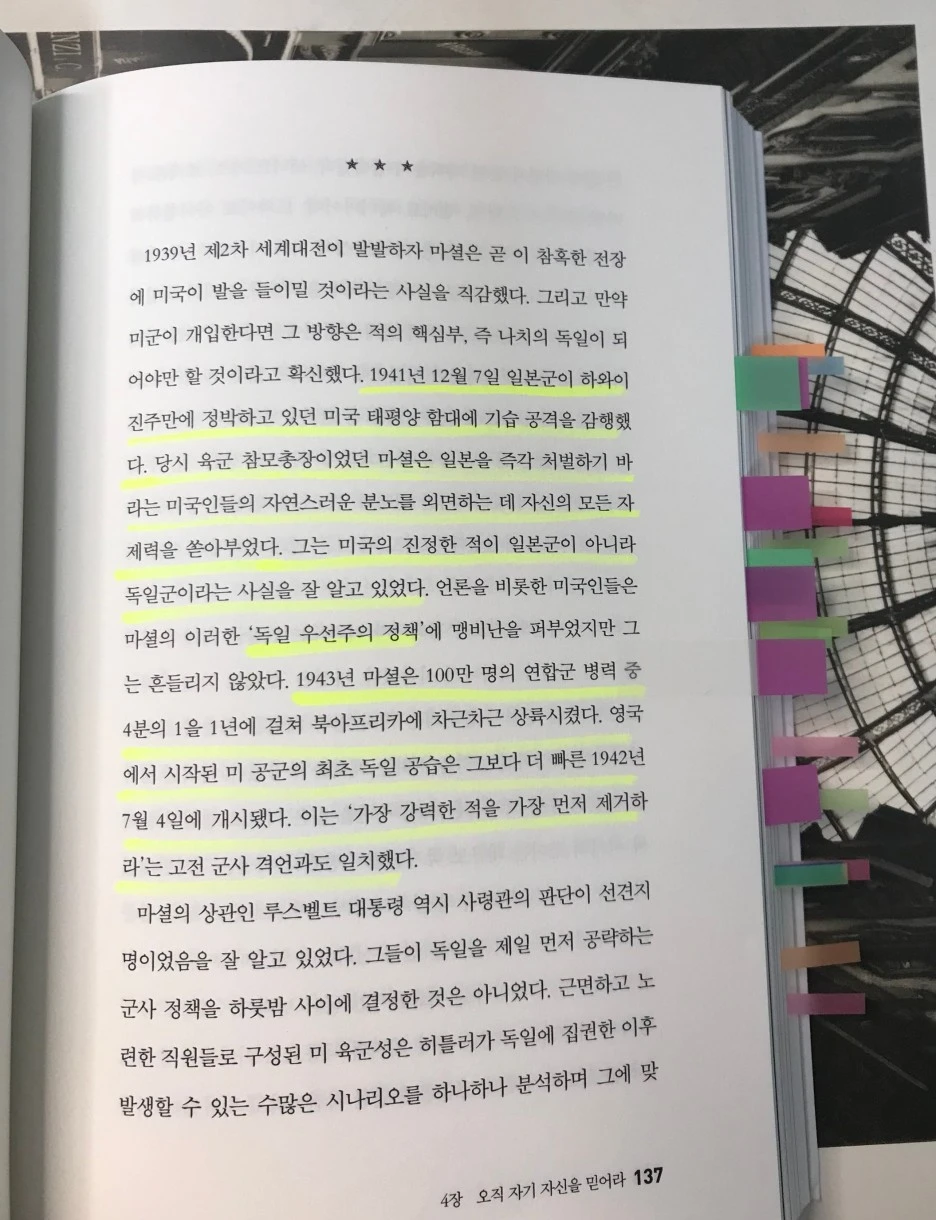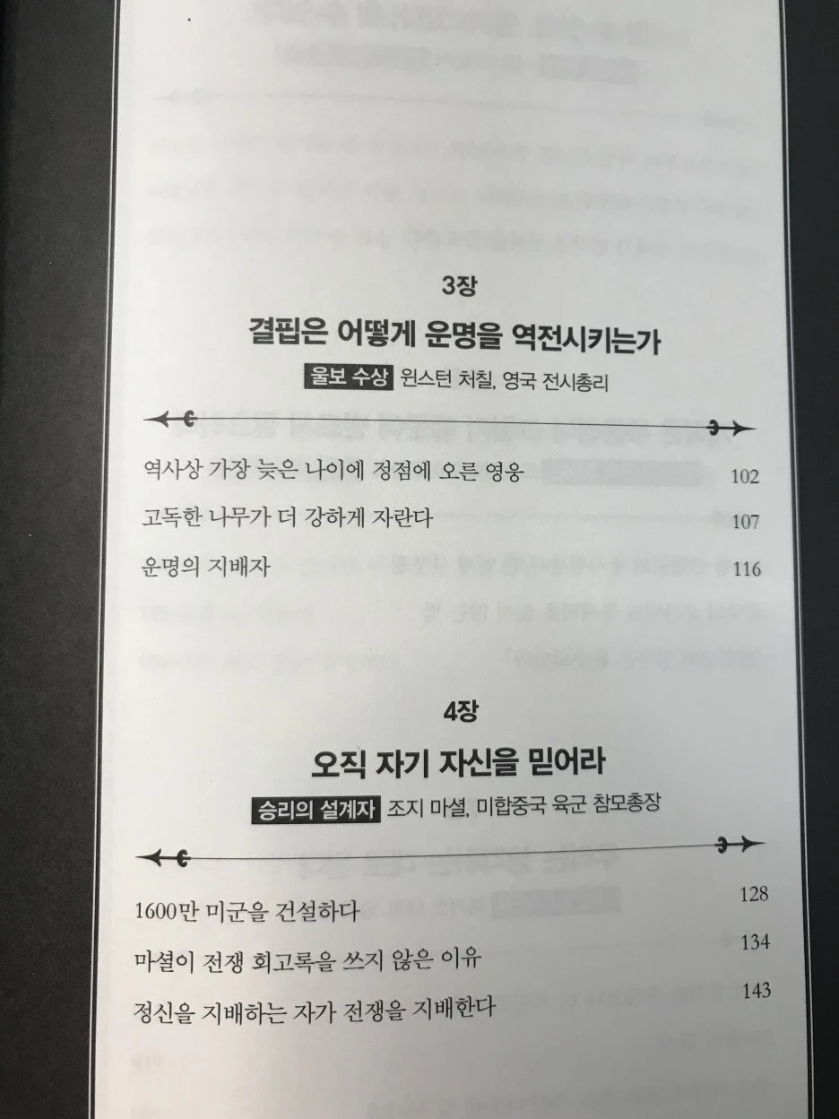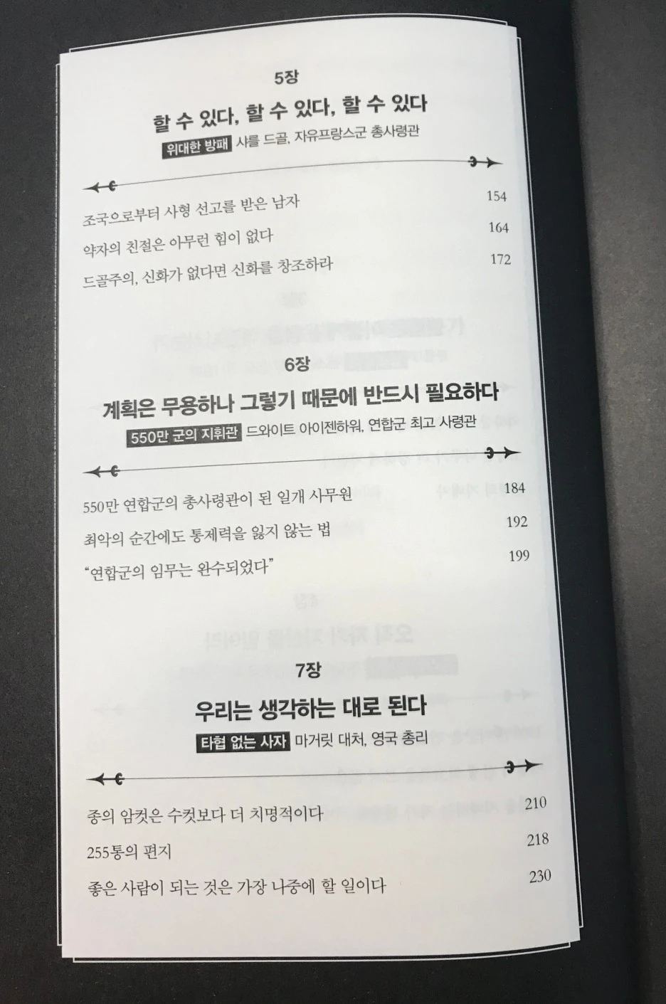 난 이 책이 성공한 지도자들의 공통점과 차이점 그리고 그들만이 지닌 성공의 DNA에 대해서 깊이 있게 파고든 것이 좋았다. 나의 단편적인 지식이 이 책을 통해 하나의 문학 작품으로 탄생했다. 책을 읽는 내내 긴장감을 유지했다 그럴 수밖에 없었던 건 이 책 속의 인물들은 삶과 죽음의 기로에 놓여 있는 고독한 리더였으며 그들은 언제 어떤 결과를 가져올지 모를 불확실성으로 가득 차 있던 세상의 중심에서 자신만의 확고한 믿음으로 겨우 버티고 있었다. 전쟁은 모두에게 불행하고 이긴 쪽이나 진 쪽이나 모두에게 물리적으로든 정신적으로도 상처만 가득했지만 전쟁에서 살아남기 위해서는 싸워야 했고, 승리해야 했다. 그러한 전쟁에서 죽음의 두려움을 이겨내고 어떻게든 승리를 얻어내고자 했던 이 책 속의 지도자들은 모두가 영웅이다. (물론 히틀러와 스탈린은 제외이다. 이들은 너무 많은 이들을 죽음으로 몰고 갔다.)