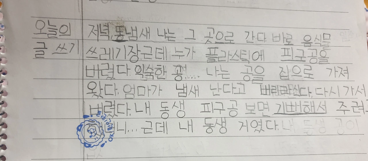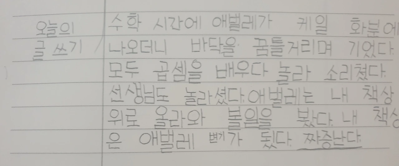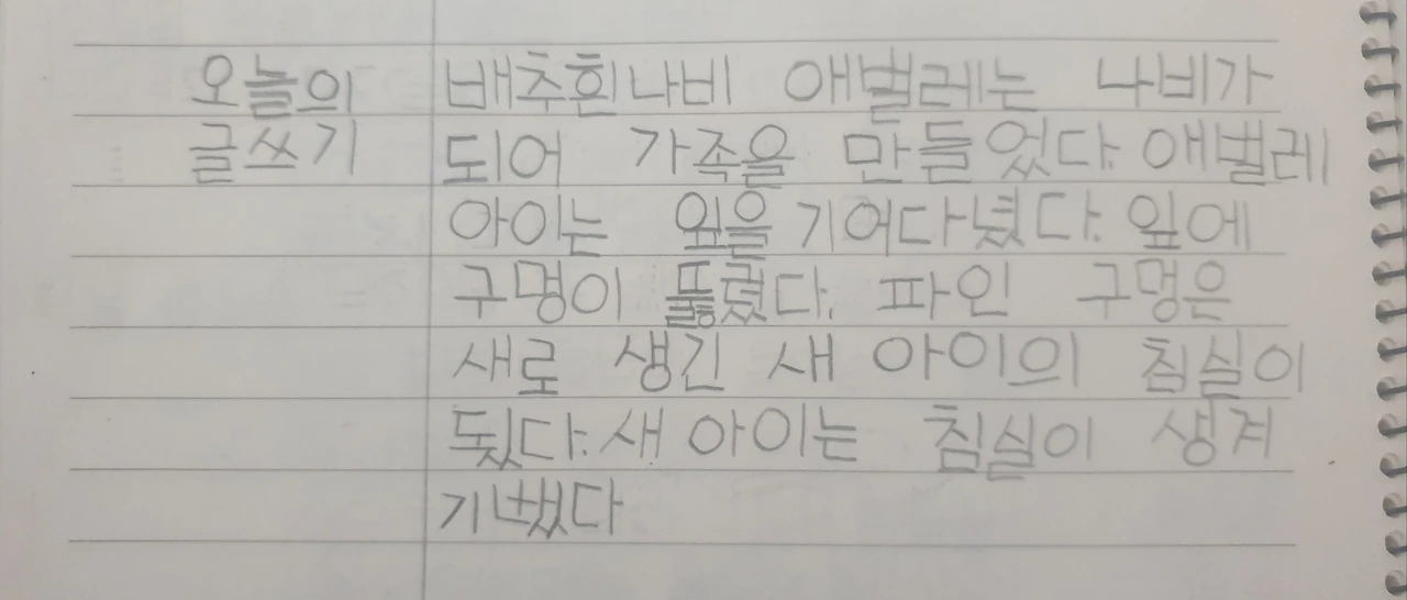 나비의 한살이를 배워서 그런가 애벌레 이야기기 많구나. 교실에서 키운 방울이 형제들은 나비가 되어 잘 날아가서 다행이네 점점 쓰기 싫구만! 글씨 크기가 옆으로 커지는 것이. 구멍이 어떻게 침실이 되냐?^^