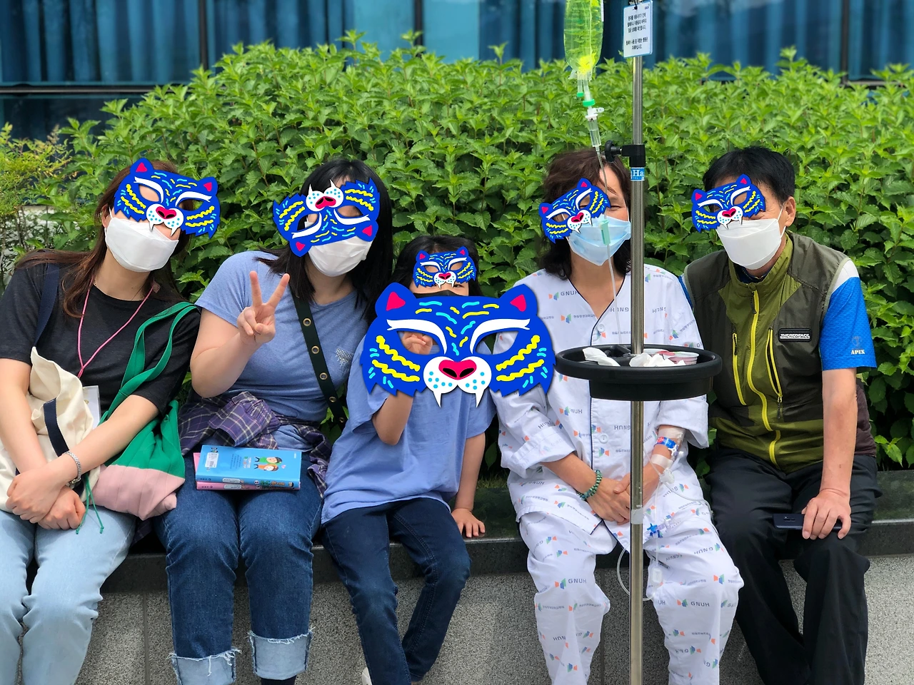 이 문장을 받고 나는 수많은 사진 중에서 이 사진들을 골랐다. 병원 안에 온 식구가 들어갈 수 없어 병원 앞에서 가족들이 모여 사진을 찍었다. 엄마의 입원 복만 아니면 병원 앞인 줄도 모르게 모두들 함박웃음을 짓고 있다. 엄마의 건강히 빠르게 회복되어 모두들 기뻐했다. 그때 내가 했던 다짐들이 떠오른다. 그때의 나는 엄마가 다시 돌아옴에 감사했다. 이제부터 나는 엄마에게 전화를 자주 하는 살가운 딸이 되어야지 하고 다짐했었다. 그런데 인간은 망각의 동물이고 이기적인 둥물이 분명하다. 지금 내가 엄마에게 하고 있는 행동을 보면 2년 전 다짐했던 나는 사라진 것 같다.