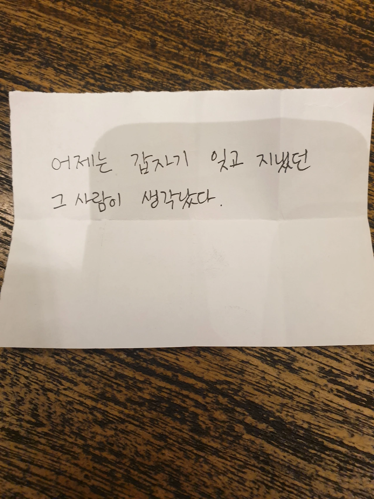 오랜만에 글쓰기 모임을 대면으로 했다. 차를 끌고 9분 만에 갈 수 있는 거리라 더 기분이 가뿐했다. 오늘은 각자 문장을 한 문장씩 쓰고 뽑기를 하기로 했다.