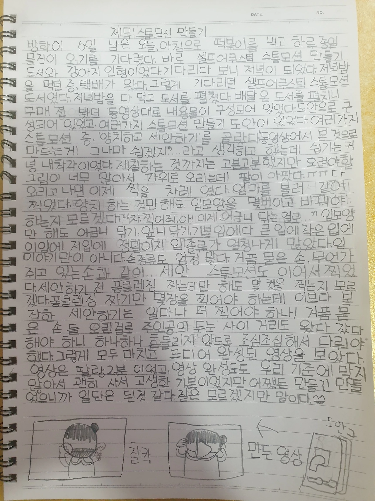 많이 힘들이지 않고 만들어낸 30초짜리 동영상을 만드는 것은 서로 뿌듯했고 기분이 좋았었지. 그리고 너는 스톱모션이라는 장르에 재미를 붙였는지 " 엄마, 00 책 사주면 안 돼?"라고 물었었지. 옷 입는 스톱모션, 먹는 스톱모션을 만들 것이라는 너의 거창한 계획에 겁을 먹었던 탓이라기성품을 사면 수고도 덜고 퀄리티도 보장이 되리란 생각에 냉큼 사줬었지. 소풍 가기 전날처럼 물건 오기만을 설레는 마음으로 기다리는 너를 보며 나도 그 물건이 얼른 오길 바랐었지.