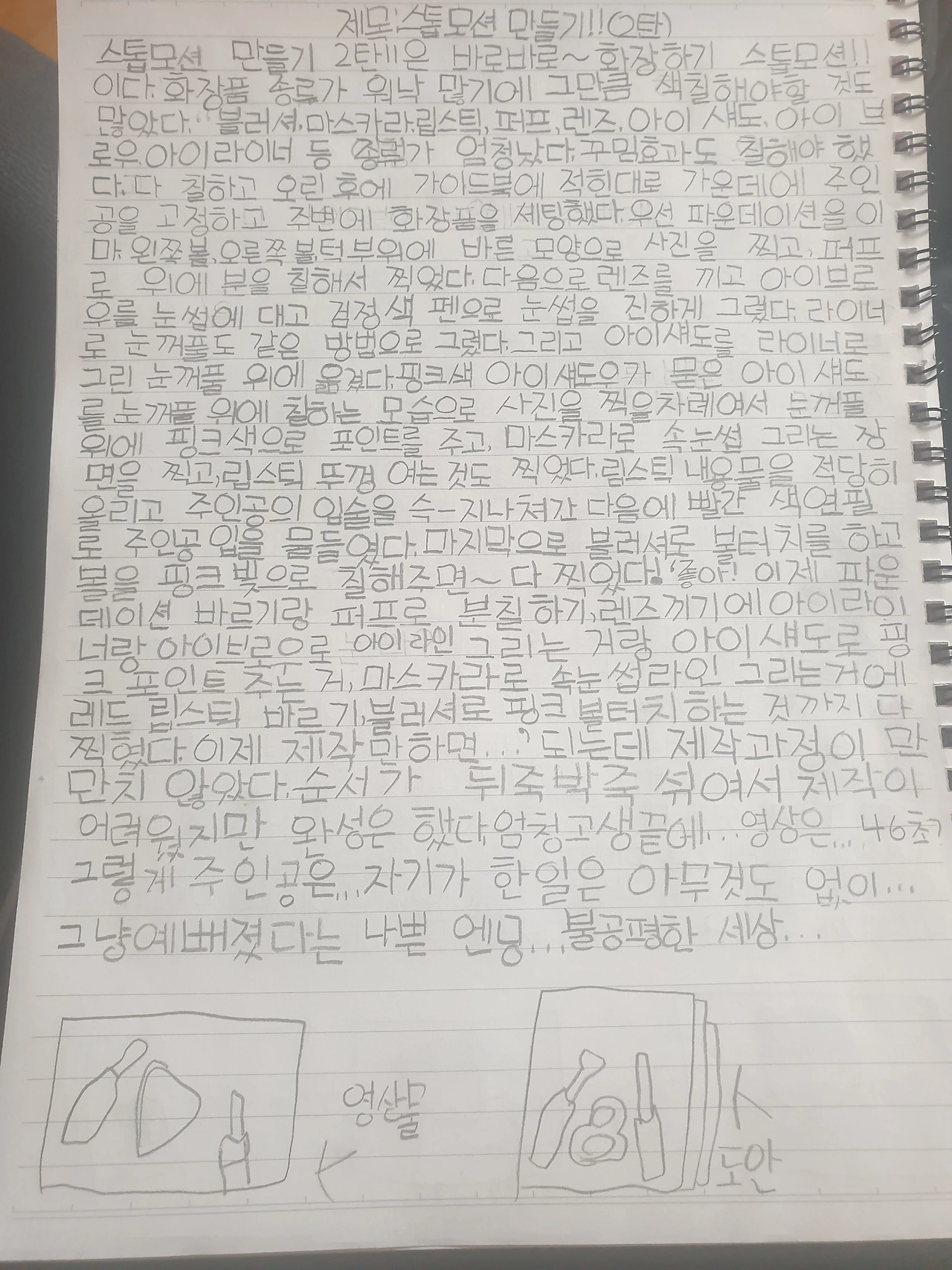 그리고 '화장을 하는 스톱모션'을 하겠다고 했지. 아 나는 이것이 이렇게 힘든 일이었으면 시작하지 않았을 것이야. 처음부터 눈을 번쩍 뜬 인물이면 되는데 렌즈를 껴야 눈을 번쩍 뜨게 만든 것일까? 눈도 큰데 마스카라 컷은 왜 넣어야 하는 거니? 입술선도 분명한데 립스틱은 왜 바르는 것일까? 50초도 안 되는 동영상을 위해 나는 무려 150장이 넘는 사진을 찍어야 했었지. 그마저도 배터리가 꺼지는 바람에 두 핸드폰으로 사진을 찍어 순서가 뒤엉키고 둘 다 만족스럽지 않은 동영상을 얻었지.