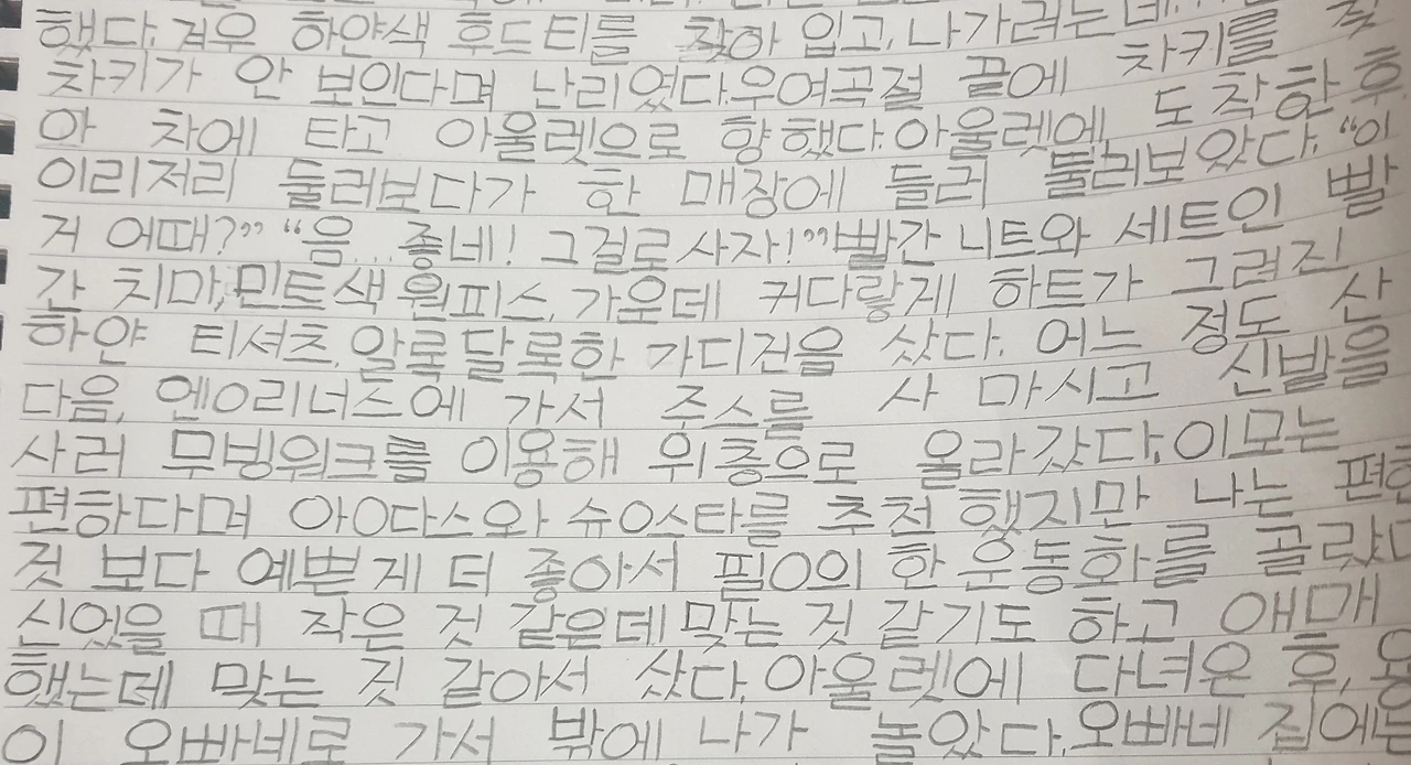 너는 참 부지런히 글을 써. 엄마 친구가 사 온 줄이 많은 줄공책에 여백 없이 써 내려가더군. 어떤 날은 며칠씩 걸리기도 해서 힘들어 하는 것 같아서 반은 그림으로 그리거나 이틀을 나눠서 쓰라고 해도 고집을 꺾지 않더군.
