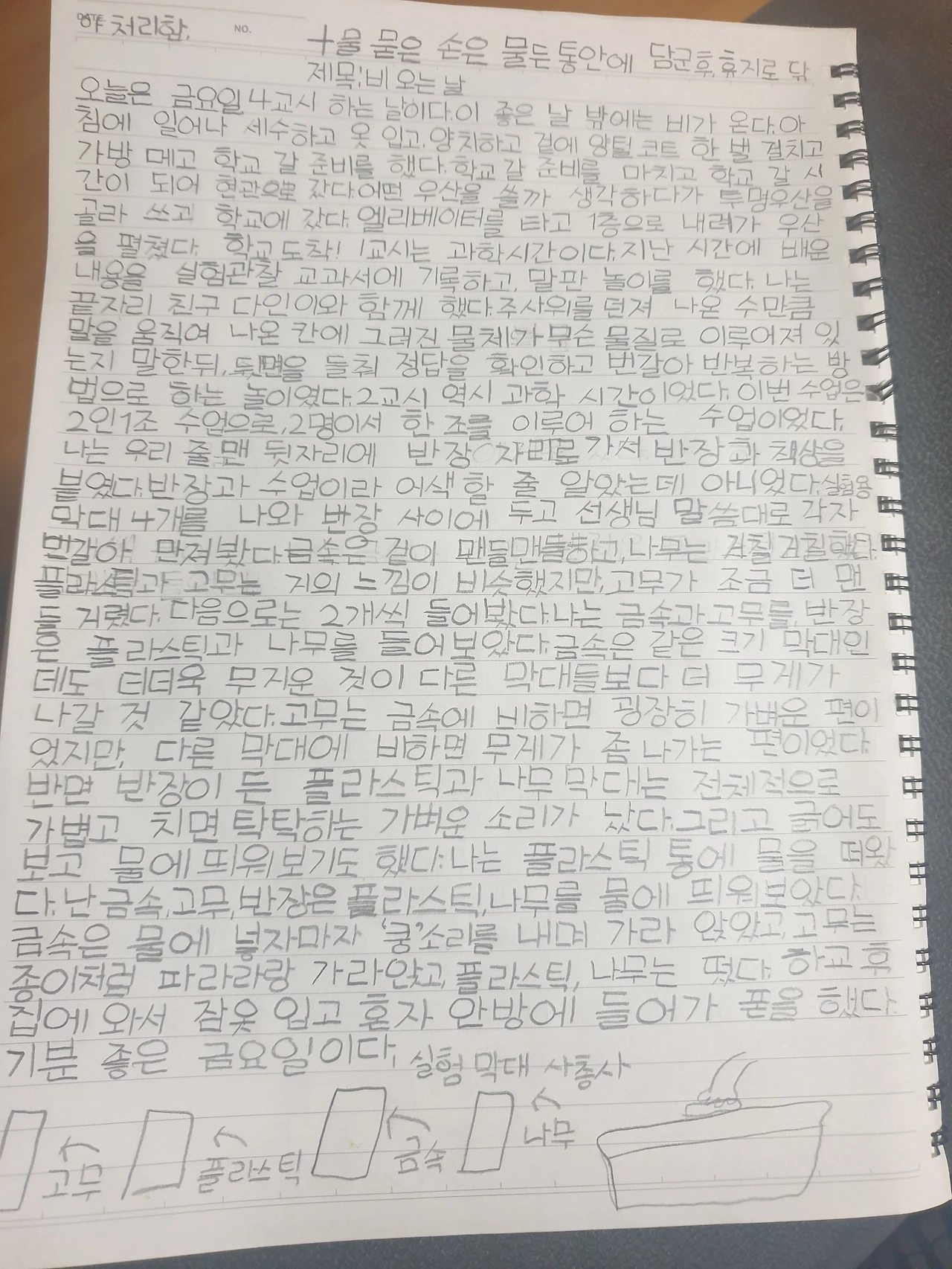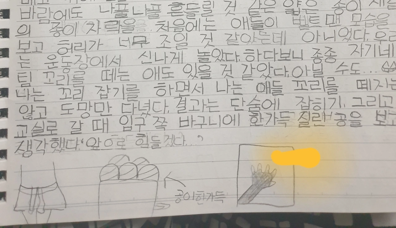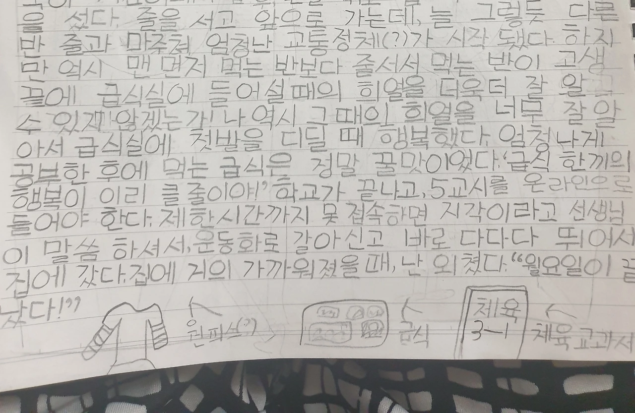 숙제 많이 내주시는 꼼꼼하고 성실하신 너의 담임 선생님이 다행히 일기 숙제는 내주지 않으시는구나. 다행이다 싶다. 네 일기를 보면 담임 선생님이 놀라실 것 같구나. CCTV같이 세세한 너의 수업 일기, 나는 부모로서는 뿌듯한데 교사로서 내 제자가 저런 일기를 쓰고 있다면.... 오우 마이 갓... 무섭구나....
