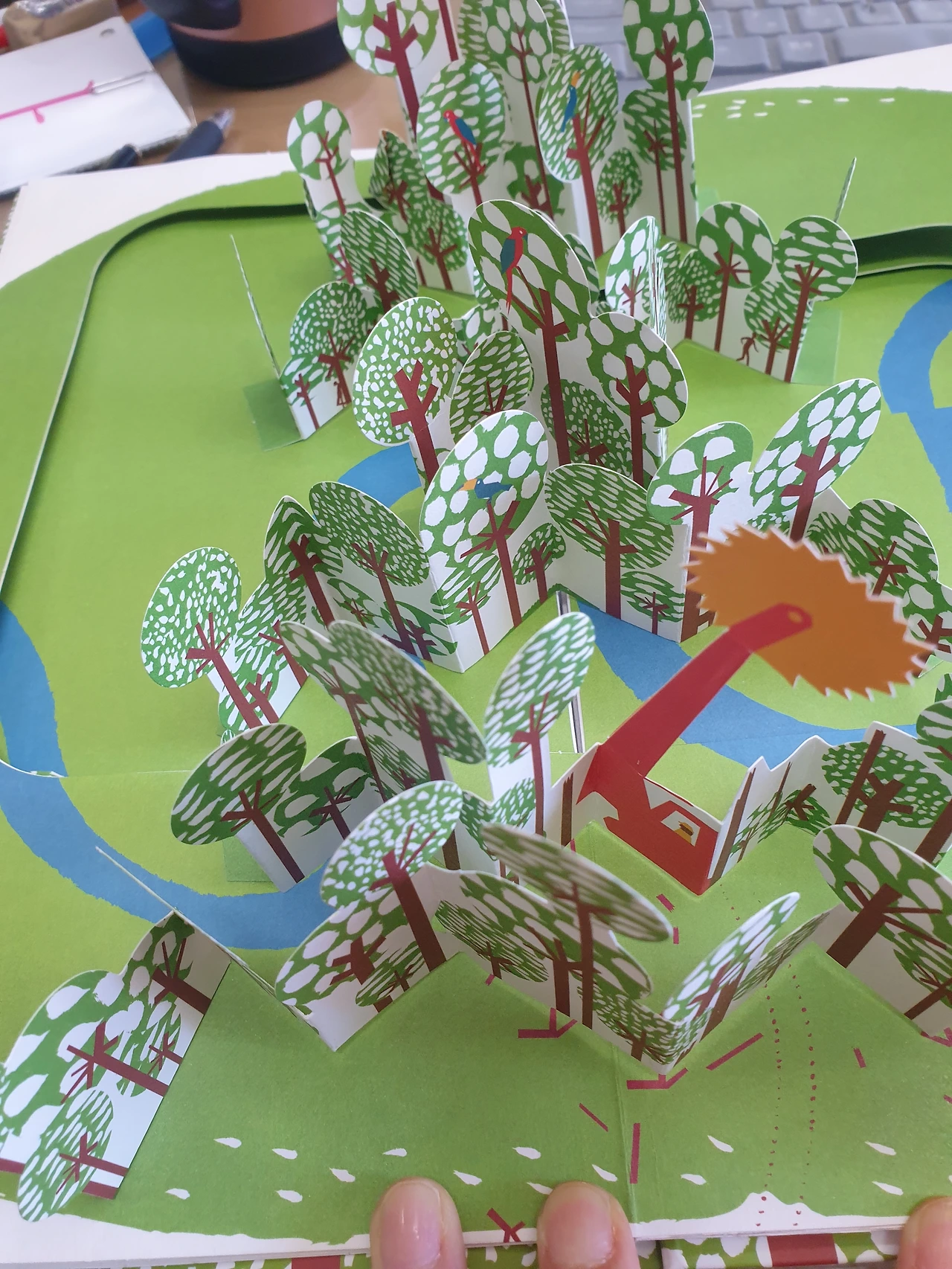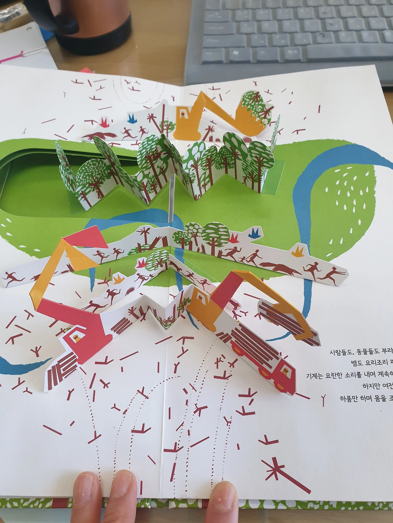 팝업북이라 장을 넘길 때마다 울창한 나무 숲이 벌떡 벌떡 일어난다. 그러면 아이들은 "와 신기하다. 나무다 나무!" 하면서 피면서부터 아이들의 이목을 집중할 수 있게 하는 책이다.