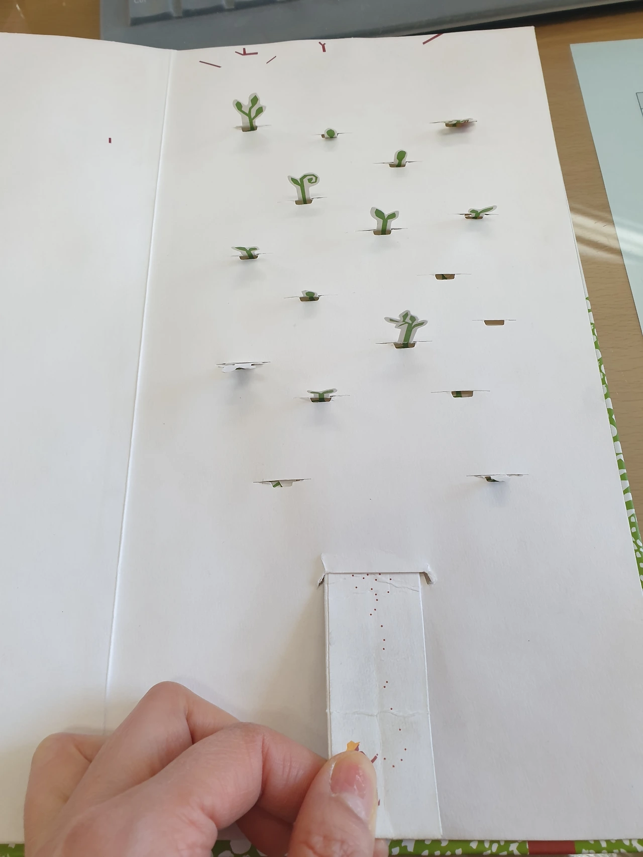 지금은 그림책 연수를 어른들도 많이 하게 되어 그림책에 대한 인식이 예전보다는 많이 바뀌긴 했다. 하지만 아직까지 그림책은 아이들이 읽는 유치한 책이라는 인상이 강한 듯하다. 나도 사실 그림책에 관심을 가지게 된 것도 내 아이를 키우면서 저학년을 하게 되면서이다. 친구를 통해서 알게 된 몇몇 그림책 중에 특히 이 책 아누크 부아로베르와 루이리고의 합작품 " 나무늘보가 사는 숲에서"와 로버트 사부다의 팝업책을 처음 접했을 때 그 놀라움은 아직 잊히지 않는다. 하나의 예술품이구나라는 느낌을 지울 수가 없었다. 오늘 나무늘보를 찾기 위해 나온 아이들도 나무늘보의 행방도 궁금하지만 이 팝업책을 조금 더 가까이 보기 위해 나왔을 것이다. 아마 오늘 우리 아이들도 나만큼 놀라워서 직접 확인하지 않고는 못 견뎠을 것이다. 이 예술품의 가격은 온라인으로 26,000원이다. 작가의 노고에 비해 싼 값일 수도 있겠지만 누군가에게는 살짝 부담되는 가격일 수도 있다. 공교육에서라도 이런 책을 접할 수 있게 부지런히 사들여야겠다. 며칠 뒤면 새싹이 몇 개 시들어져 있을 것 같지만, 팝업북이 벌떡 일어나지 못할 것 같지만