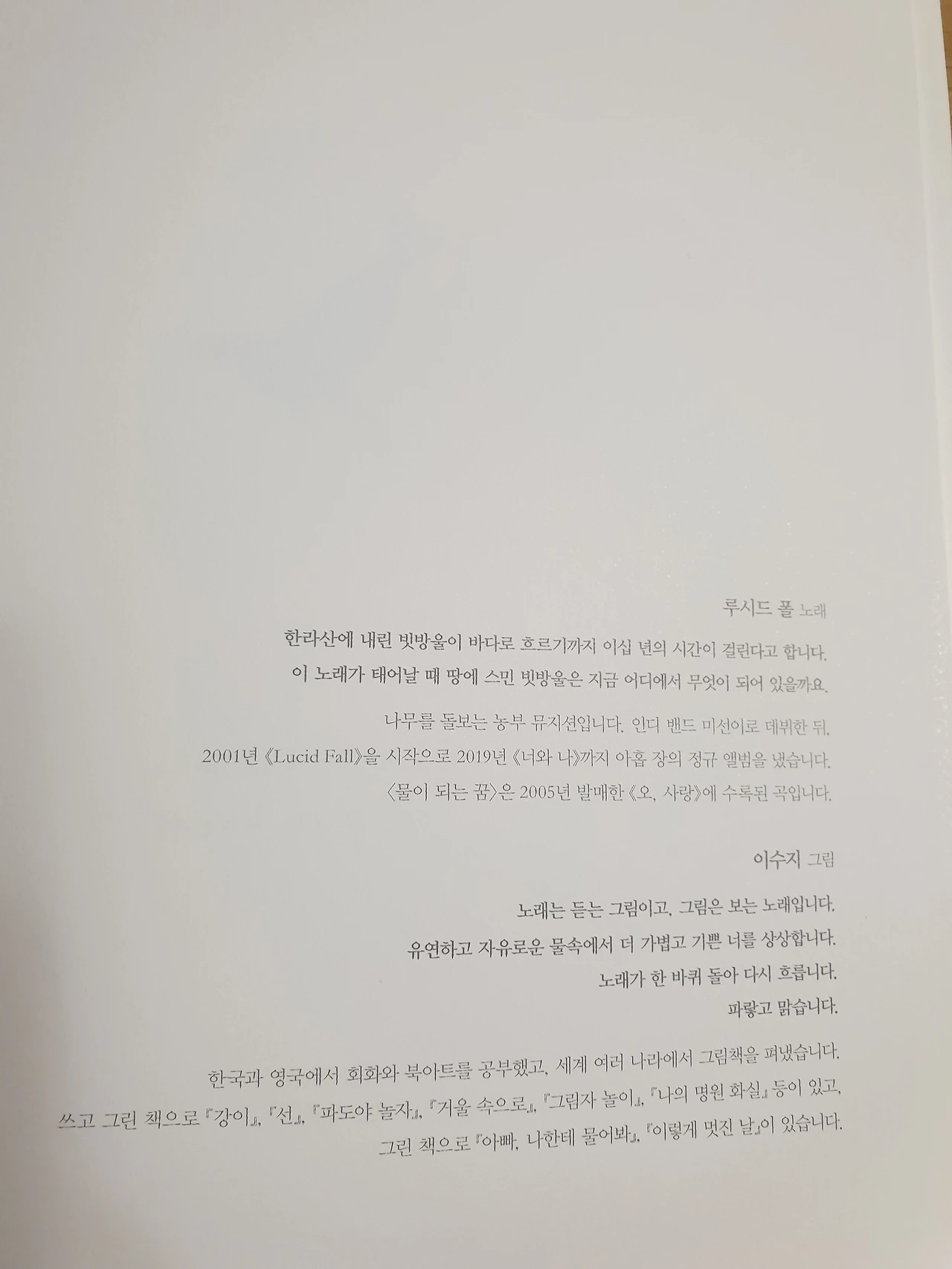 작년 내가 하는 책 모임에서 동네서점 탐방을 간 적이 있다. 동네 서점에서 읽고 싶은 책을 한 권씩 고르라고 회장님이 말했다. 나는 무슨 책을 고를지 몰라서 망설이고 있는데 책모임 회장님이 자신의 최애 책이라고 '물이 되는 꿈'을 나에게 추천해주셨다. 좋아하는 루시드폴과 요즘 제일 잘 나가는 이수지 작가님의 조합이라 실망시키지 않을 것이라는 믿음은 있었다. 내 딸과 한 번 읽은 다음 조용히 책장에 반 개월 넘게 방치되어 있었다.