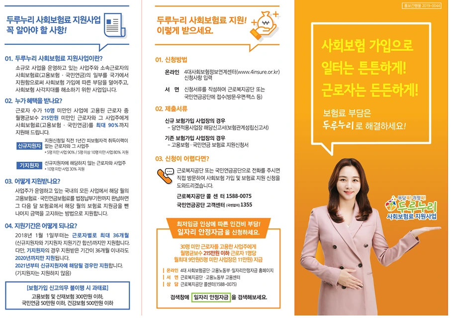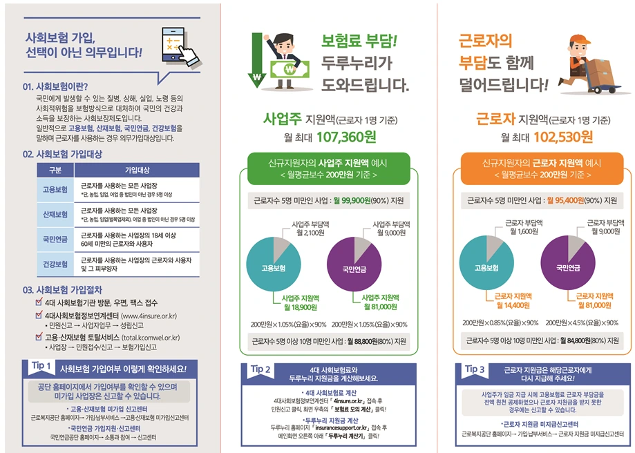 소규모 사업주와 노동자의 사회보험료(고용보험·국민연금)의 일부를 국가에서 지원하는 정책이다. 사회보험 가입에 따른 부담을 덜어주고, 사회보험의 사각지대를 해소하기 위해 도입됐다.