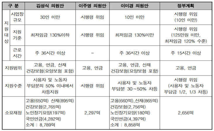 다만 지원대상 및 지원기준을 어떻게 설정하느냐에 따라 사회보험료 지원에 소요되는 비용이 크게 달라진다는 점을 고려하여, 지원대상과 지원요건을 다소 제한적으로 정할 수밖에 없는 점이 고려됨.