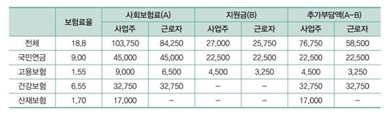 위 표를 기준으로 계산해본다면, 월급 100만원을 받는 노동자는 두루누리 사업을 통해 월 기준 국민연금 보험료 2만2500원, 고용보험료 3,250원을 지원받는다. 하지만 비슷한 금액을 추가로 내야 하는데다, 건강보험료 3만2750원은 한 푼도 지원받지 못한 채 추가로 내야 한다. 그동안 내지 않던 돈 5만8500원을 추가로 내야 하는 것이다. 사업주는 사업주대로 노동자 한 명당 매달 총 7만6750원의 보험료를 더 내야 한다. (월보수 200만원 노동자로 계산해보아도 혜택은 사업주 월 43,560원 / 노동자 월 41,760원 정도이다.)