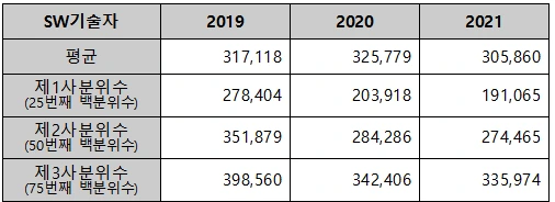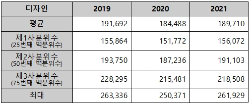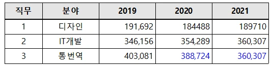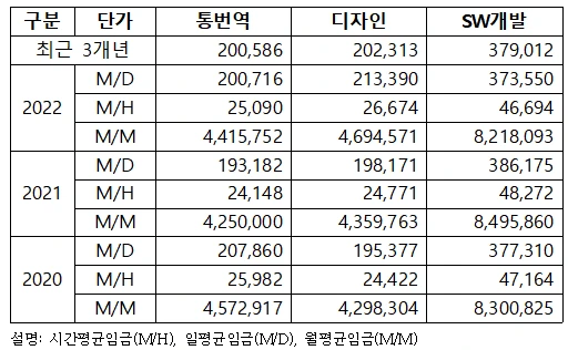 국가 통계자료는 ① 디자인 분야는 ‘디자이너 등급별 일 임금단가’ ② IT/프로그래밍 분야는 ‘SW기술자 평균임금’, ③ 번역ㆍ통역 분야는 ‘통·번역가 평균임금’를 활용하였다.