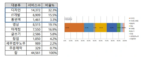 2023년 5월 기준 플랫폼의 활성화 1위 디자인 분야에 게시된 서비스 갯수는 14,372건이다. 디자인 분야의 최근 3개년의 거래내역을 확인해보면, 연 평균 거래건수는 92,725건이며, 연 평균 거래금액은 135억 5천만원이다. 뒤를 이어 2위 IT개발은 6,909건, 통번역은 1,461건이 게시중이다.