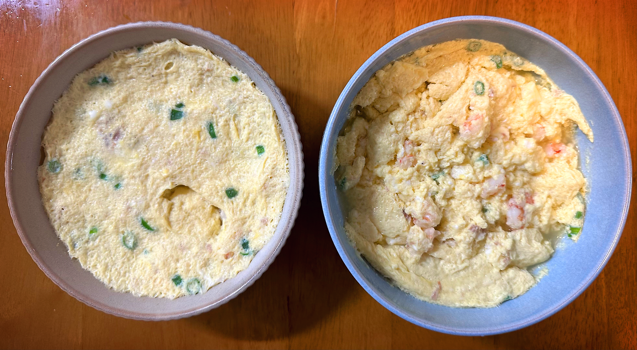 (계란 1개당 물 50ml. 뜨거운 물을 넣으면 보드라워진다는데, 번거로움 대비 차이는 별로...)