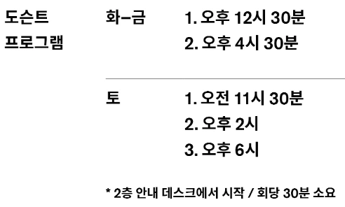 화요일부터 금요일까지 오후 12시 30분과 4시 30분, 토요일 오전 11시 30분, 오후 2시, 오후 6시에 진행되는 도슨트 프로그램에 참여하여 작품에 더 가까이 다가가는 시간을 가져보세요! 많은 분들의 관심과 참여 바랍니다.