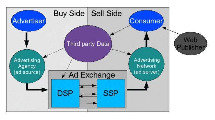 이처럼 경매를 하게 되면 경매를 하게 될 '중개소'와 '구매자' 그리고 '판매자'가 있어야 한다. 중개소에서 구매자는 자신이 찾는 물건을 찾고, 이를 판매하는 판매자에게 가격을 부르게 된다. 이렇게 RTB 생태계는 크게 광고 지면을 사려는 쪽인 DSP(Demand Side Platform), 광고주 지면을 팔려는 쪽인 SSP(Supply Side Platform) 그리고 구매자인 DSP와 판매자인 SSP 사이에서 중개를 하는 중개소인 'AD Exchange'가 있다.