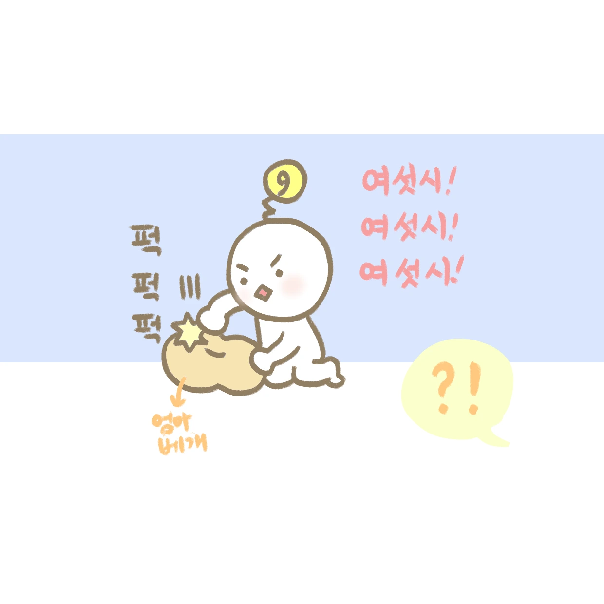 베개를 마구 치며 알림 시간을 외치는 아이.