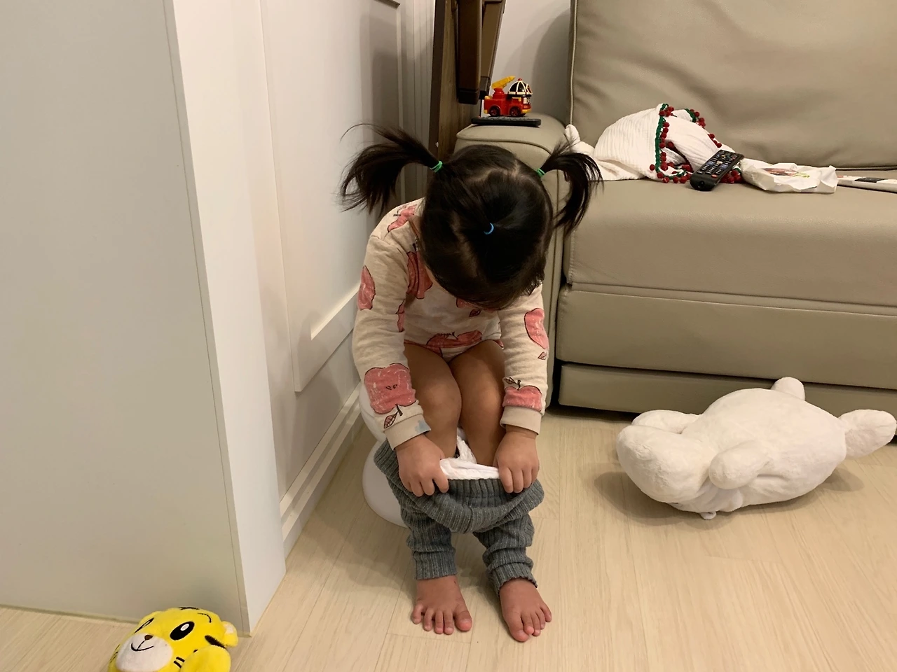 아이는 쉬 마렵다, 응가 마렵다 표현을 잘하면서도 화장실에 가자, 하면 머뭇거리다가 그냥 팬티에 쉬를 했다. 밖에 나가서는 꼭 화장실에서 용변을 보면서도, 집에서는 놀다가 그 자리에서 쉬를 하기도 했다. 쉬할 때가 된 것 같아서 (속으로는 아이가 쉬를 할까 봐) 화장실에 가자고 물으면 괜찮다, 안 마렵다고 하다 얼마 뒤 실수를 하는 경우도 잦아졌다.