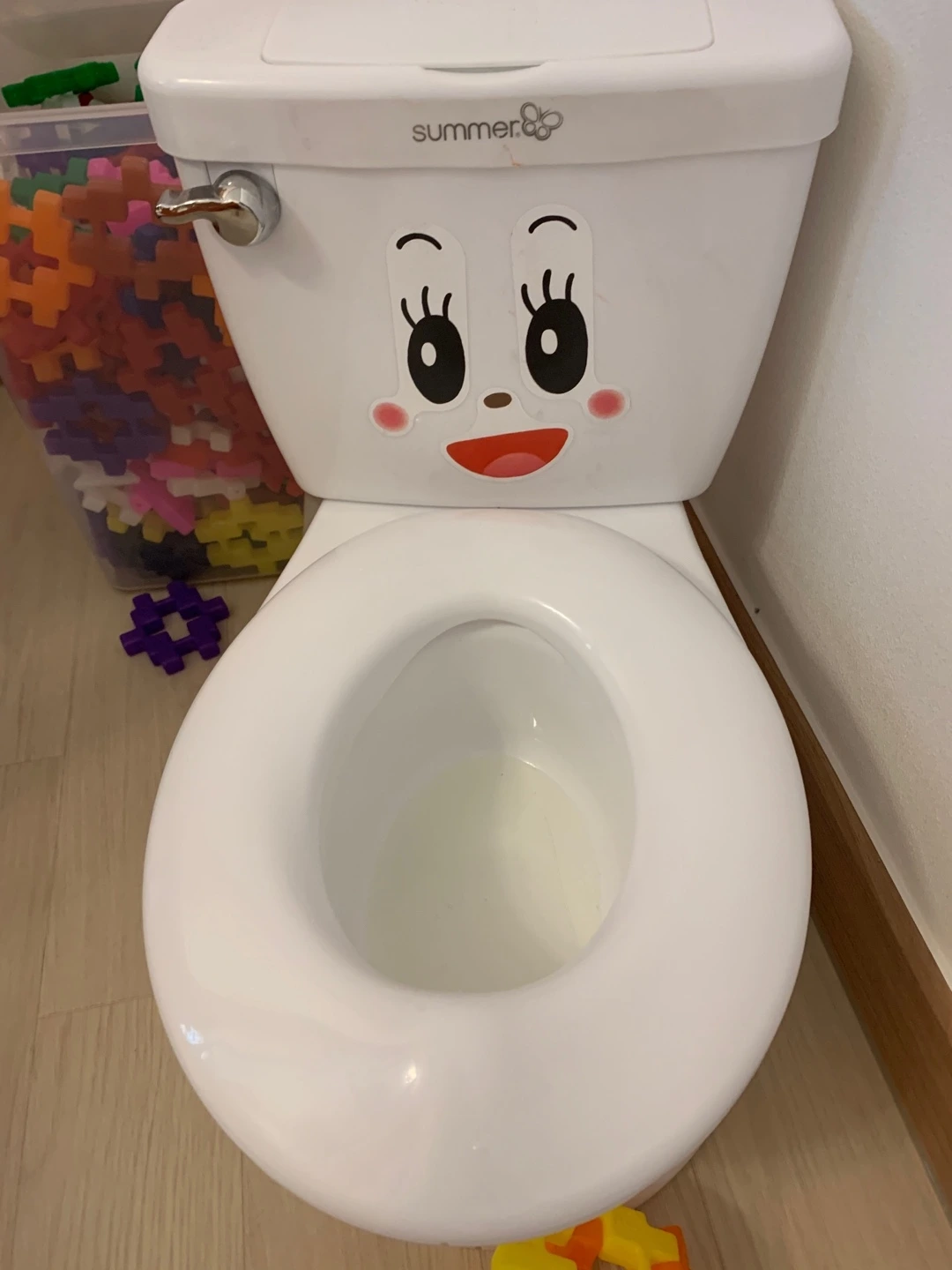기저귀를 입은 채로 앉아 쉬하는 시늉도 하고, 끙끙 소리를 내며 응가하는 시늉도 했다. 대소변(시늉)을 마친 후에는 어김없이 물을 내려고 시원하게 물 내려가는 소리에 물개 박수를 치며 기뻐했다. 가끔 자신이 아끼는 호비나 하마, 오리 인형이 쉬 마렵다며 자신의 변기에 앉히기도 하면서 아이는 점점 유아 변기와 친숙해졌다.
