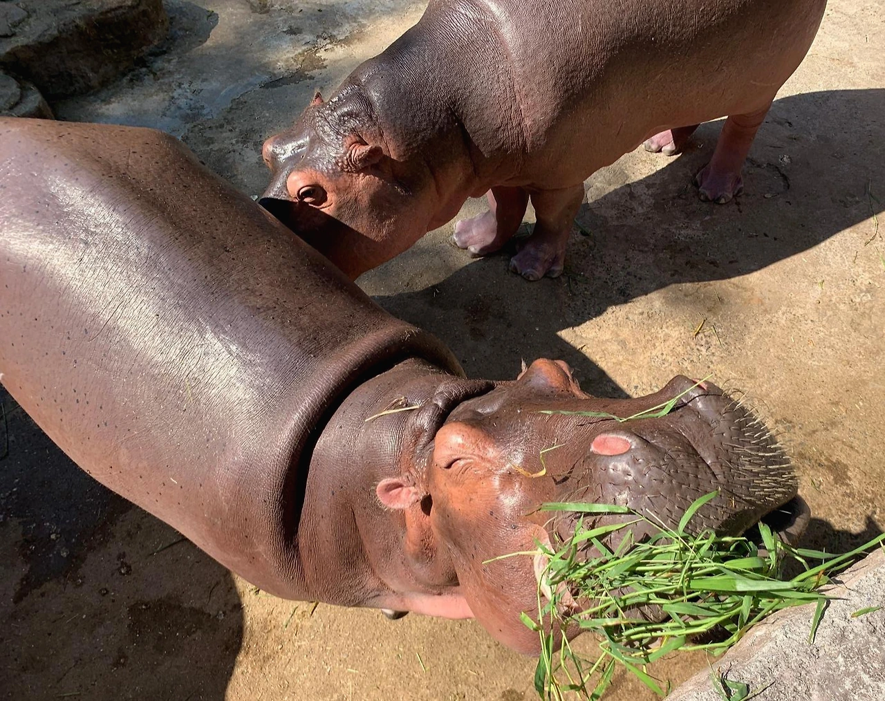 그런데 트램을 타기도 전에 대박 동물을 만났다. 덩치 큰 하마 네 마리가 우리 바로 밑에서 입을 쩍 벌리고 있는 게 아닌가. 서울대공원에 갔을 땐 물에서 잠수하고 노느라 멀리서 매끈한 등만 겨우 볼 수 있었는데, 눈 앞에서 하마 전신을, 게다가 코 앞에서 하마 입 속까지 볼 줄이야! 엄마가 먼저 흥분했다. 당장 하마 먹이를 사 와 아이와 함께 하마에게 먹이를 주기 시작했다. 하마는 야들야들한 풀을 좋아하는 모양이었다. 주는 대로 잘도 받아먹었다. 하마가 입을 한껏 벌릴 때마다 아이도 한껏 신이 났다.