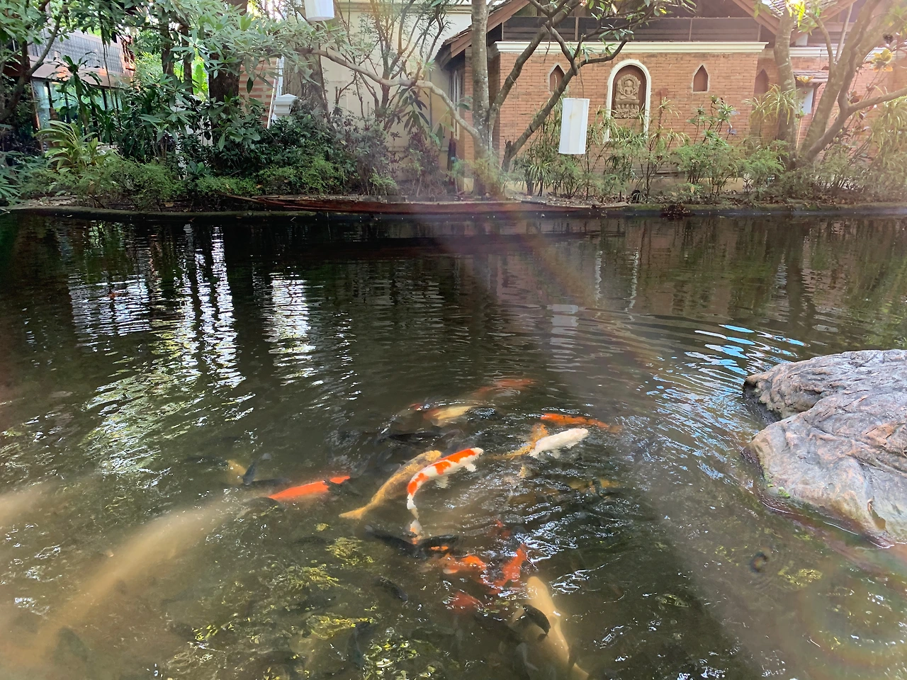 두 번째 숙소인 쿰 파야 리조트의 연못에는 커다란 잉어와 다양한 종류의 물고기들이 많이 살고 있었다. 조식으로 먹다 남은 빵을 가져와 연못에 던져주니 물고기들이 우르르 달려와 먹었는데 그게 재밌는 채유는 묵는 내내 물고기 밥으로 조식 빵을 꼭 챙겨 왔다.