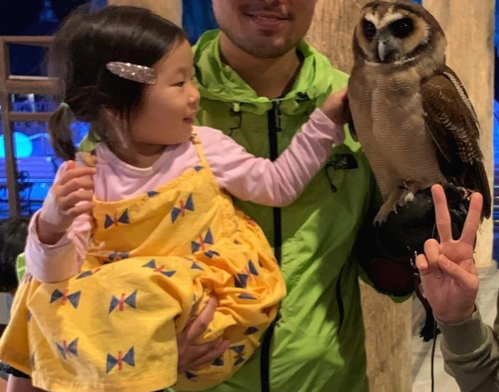 호랑이쇼까지 보고 입구로 나가는데, 저 멀리서 부엉이가 보이는 게 아닌가! 부엉이를 발견하자 아이보다 남편과 내가 더 기뻐했다. 부엉이를 가까이에서 볼 수 있을 뿐 아니라 팔에 앉혀 함께 사진도 찍을 수 있었다. 아이는 가장 큰 부엉이가 좋다고 했고, 그 부엉이를 아빠 팔에 앉혀 가까이서 쓰다듬고 눈도 마주치느라 정신이 없었다. 그러느라 아이는 카메라를 보지 않은 채로 사진을 찍었다.