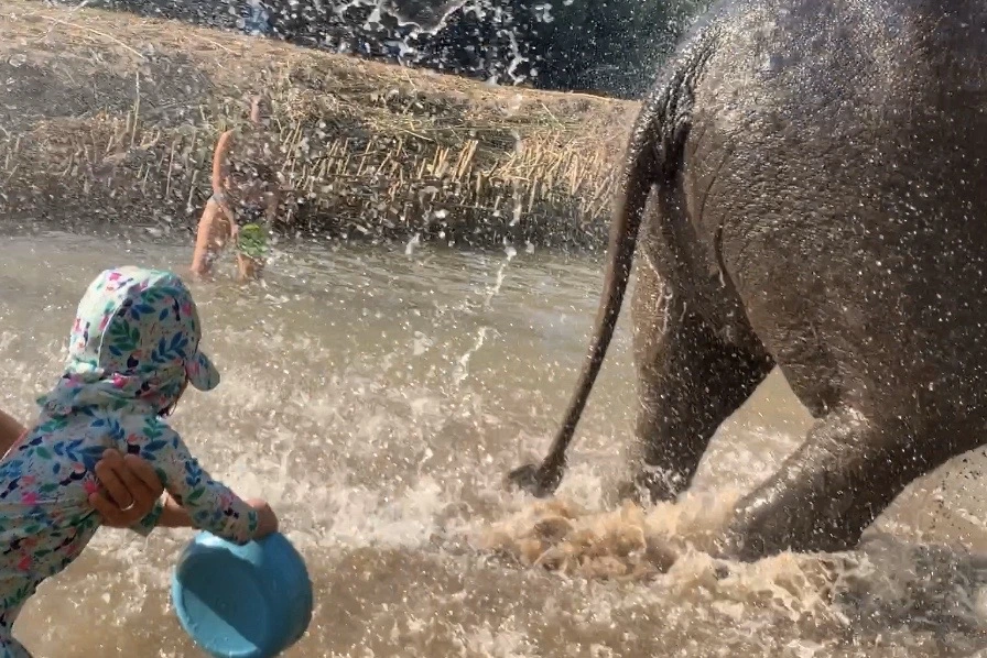 다음 시간은 코끼리 머드팩 발라주기와 수영시키기. 가까운 강물에 들어가 코끼리가 좋아한다는 진흙도 몸에 발라주고 샤워도 시켜주면서 코끼리랑 함께 강물에 퐁당 빠졌다. 다행히 물이 차지 않아 아이도 코끼리와의 물놀이를 충분히 즐길 수 있었다. 코끼리가 코로 뿜는 물세례를 맞으며 아이는 손뼉을 치며 외쳤다.
