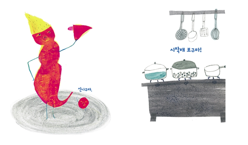 고구마 한 줄기에서 여러 모양의 고구마들이 줄줄이 나오는 모습을 포착해 이렇게 재미있는 그림책을 만들어내다니. 두 딸의 엄마인 사이다 작가님의 재치와 위트에 나도 감탄했다.