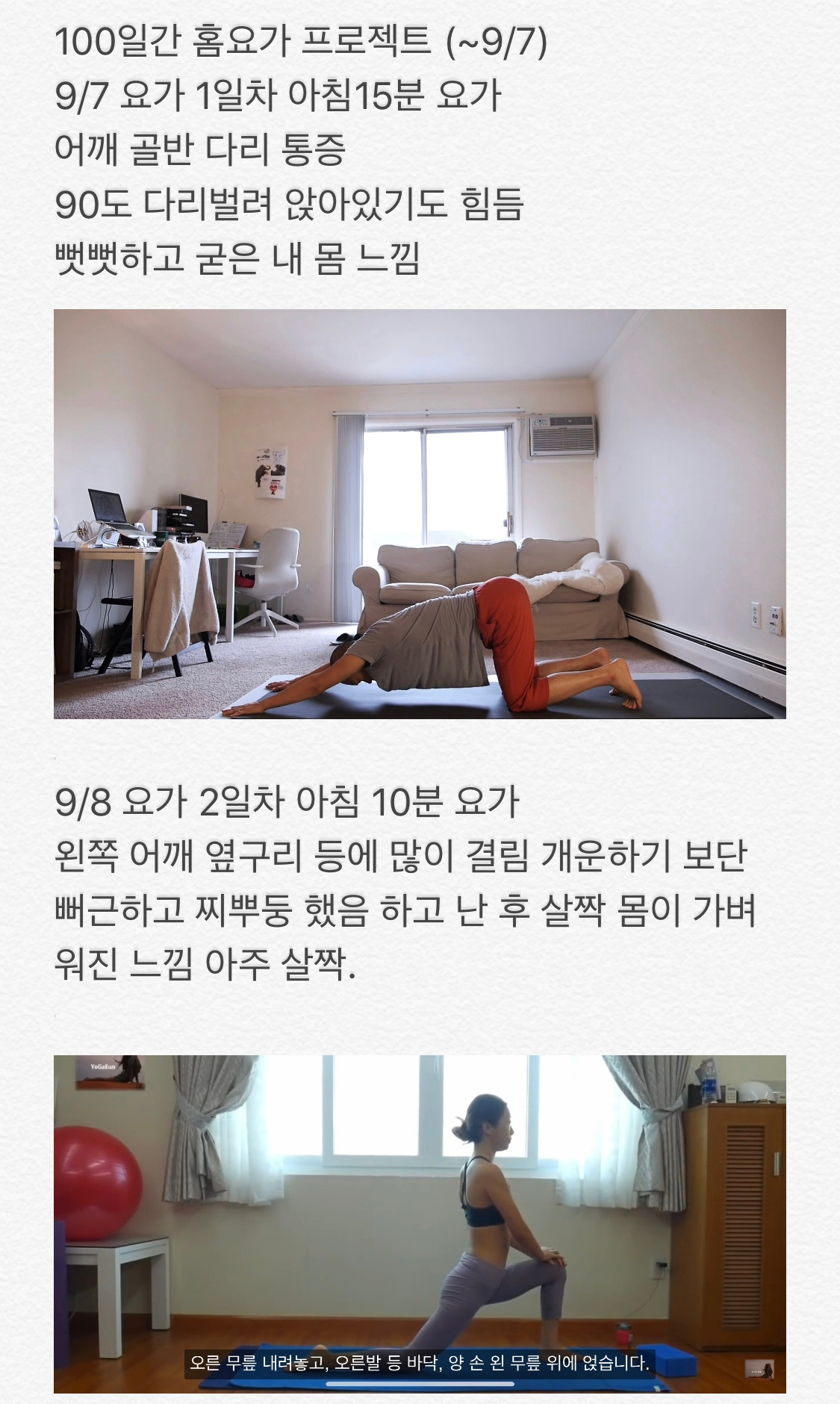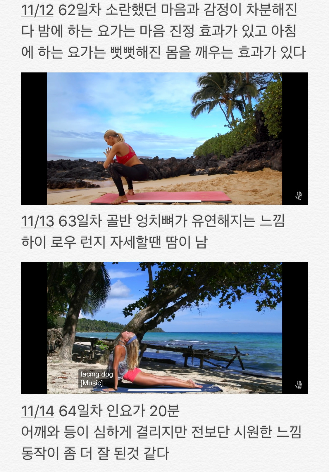유튜브에 '요가'를 치니 수백수천 개의 요가 영상이 주르륵 나왔다. 그렇게 많은 요가 유튜버가 있을 줄이야. 그중 15분 내외 짧은 수련 영상을 올리는 유튜버 위주로 선별해 매일 거실에 요가매트를 깔고서 그들을 따라 요가를 했다. 그리고 매일 수련한 영상을 캡처한 뒤, 메모장에 짧은 일지를 남겼다. 나 혼자만의 인증 절차였다. 처음에는 힘들다, 결린다, 아프다는 말 뿐이었지만, 하루하루 거듭할수록 시원하다, 전보다는 동작이 잘 된다, 조금씩 유연 해지는 것을 느낀다, 같은 소감을 남기게 되었다.