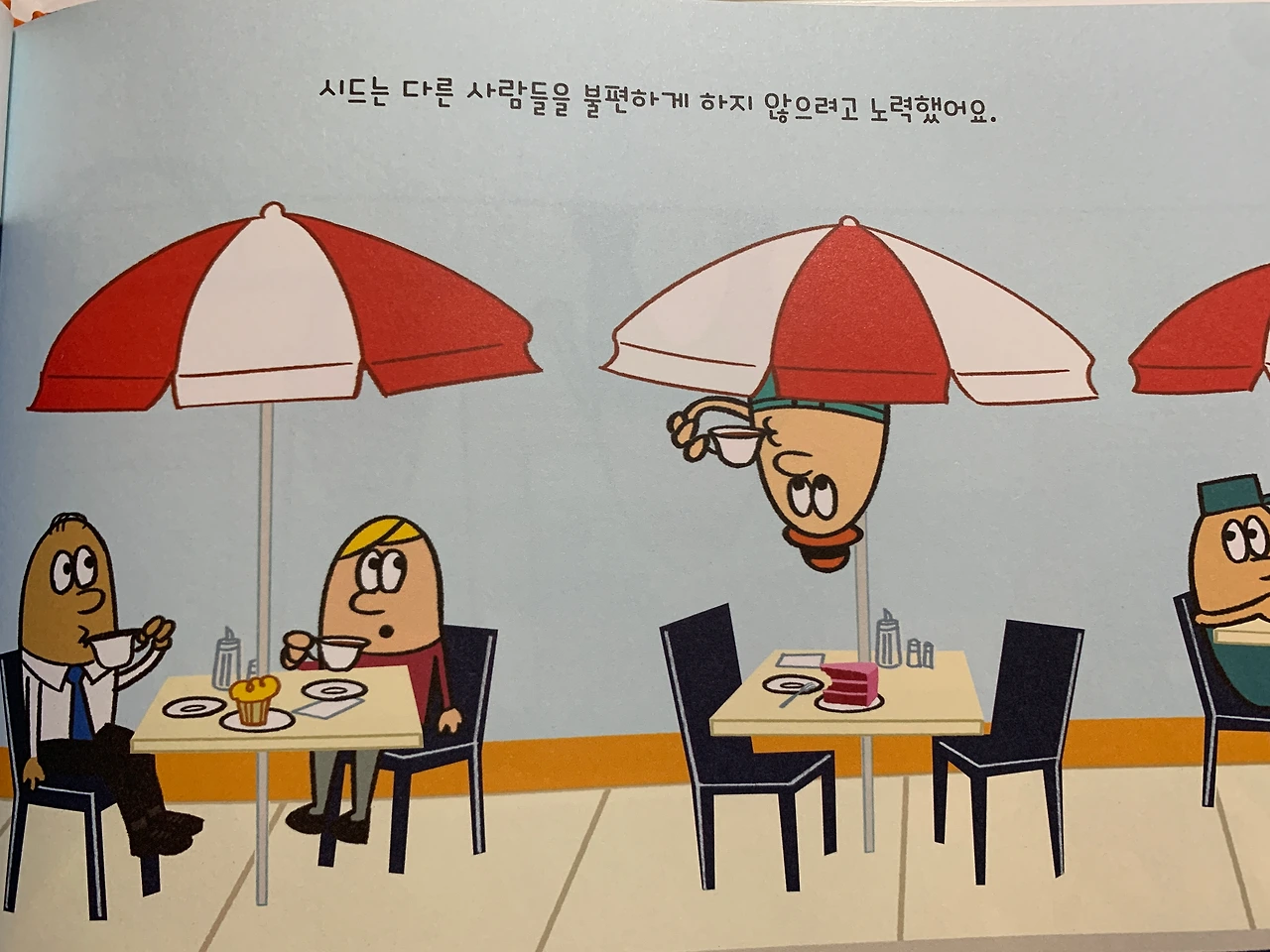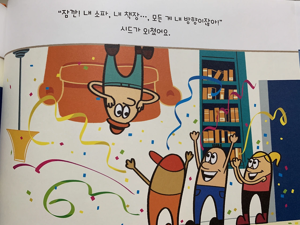"엄마랑 채유가 이렇게 앉아서 함께 책을 보는데, 시드는 이 방 천장에 매달려 있는 거야. 그럼, 시드는 이 책을 볼 수 없잖아."