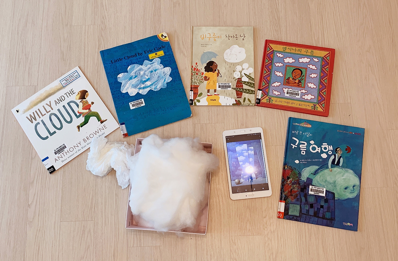 집 근처에 도서관이 있어 책을 자주 빌립니다. 도서관은 제가 다니는 수영장 옆에 있습니다. 그래서 수영 가는 화, 목이 바로 도서관에 가는 날입니다. 그렇게 매주 2회씩 책을 빌리다 보니 읽던 책도 자주 읽게 되었습니다. 봤던 책을 다른 방법으로 재밌게 볼 수 없을까, 고민하다 '구름 놀이'가 생각났습니다. 읽었던 책들 중에 구름 소재의 그림책들이 꽤 여러 권 눈에 띄었기 때문입니다. 구름 관련 책만 모아서 빌리고, 솜을 사서 준비하고, 구름 그림이 많은 르네 마그리트 작품도 탭에 저장해놨습니다.