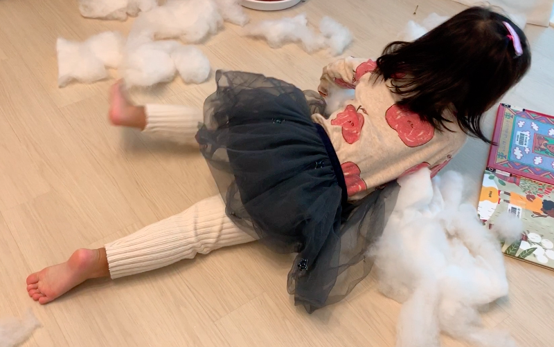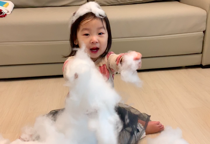 목욕할 때 했던 거품 놀이가 생각났던 겁니다. 거품을 만들어 머리에도 씌우고 몸에도 바르면서 거품 모자, 거품 옷이라고 하며 목욕하곤 했습니다. 몽글몽글 솜을 보니 딱 그 거품이 떠올랐나 봅니다. 아이는 입으로 후후 부면서 거품을 날리고 물로 씻는 흉내를 내면서 한 동안 솜으로 목욕 놀이를 했습니다.