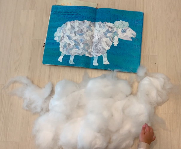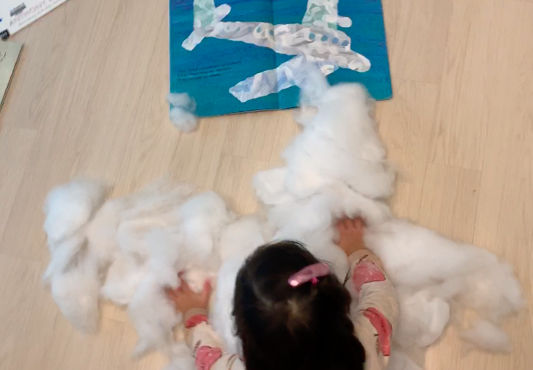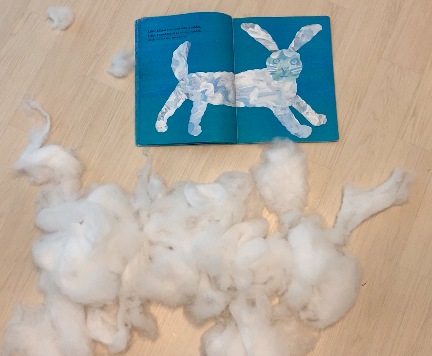 책을 펼친 후, 채유야, 여기바봐, 구름이 토끼가 되었네, 하며 책을 따라 솜으로 토끼를 만들었습니다. 다음 장을 넘겨 구름이 비행기가 되면, 똑같이 비행기 구름을 만들었습니다. 어김없이 "채유가, 채유가" 하며 달려듭니다. 이제 아이가 만들고 싶은 구름을 마음껏 만들 차례입니다.