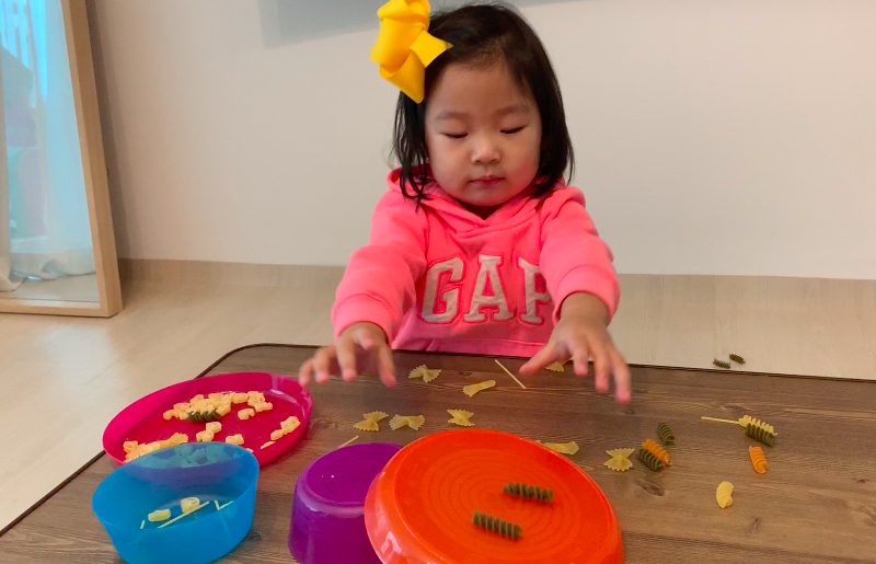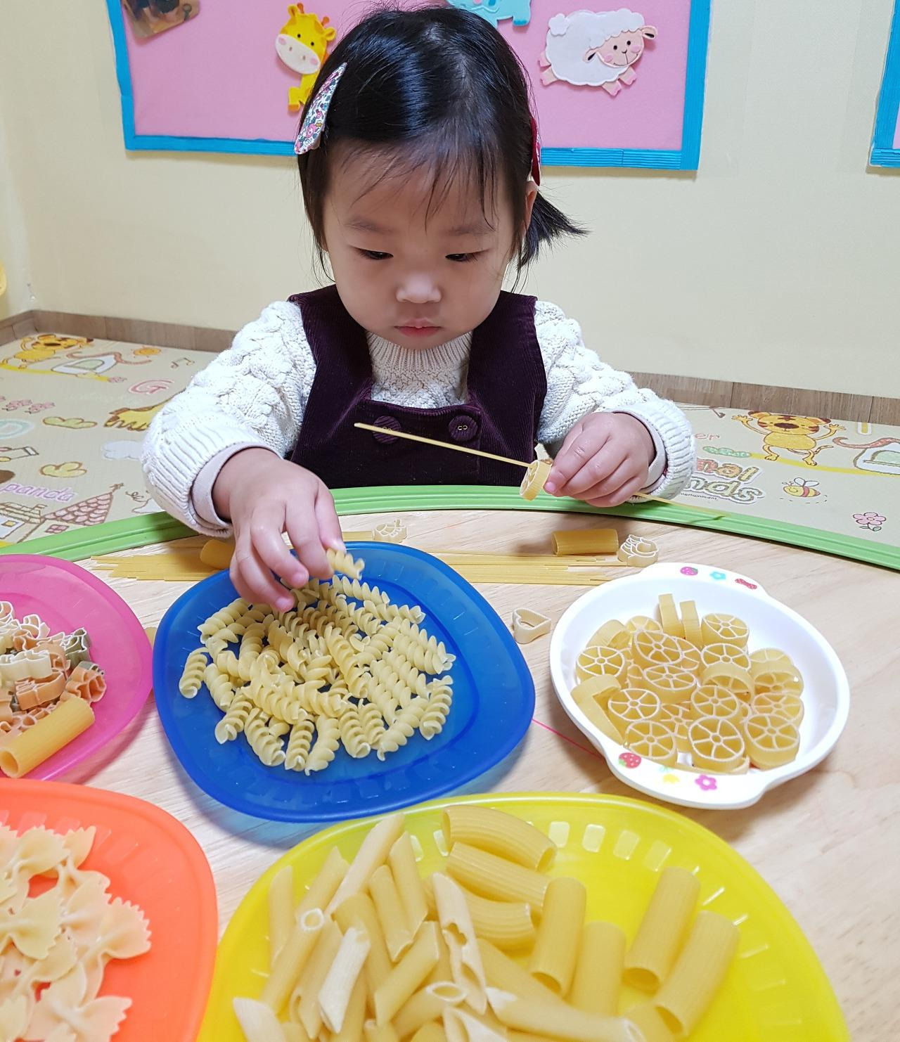 집에서 파스타 놀이를 하고 나서 얼마 되지 않아 어린이집에서도 파스타 놀이를 했습니다. 원장 선생님이 채유가 집중해서 골고루 잘 가지고 놀았다고 칭찬해주셨습니다. 아마도 집에서 놀았던 경험이 도움이 되었겠지요. 사진을 보니 어린이집에는 더 다양한 파스타가 있었고, 그래서 더 재미있었나 봅니다.