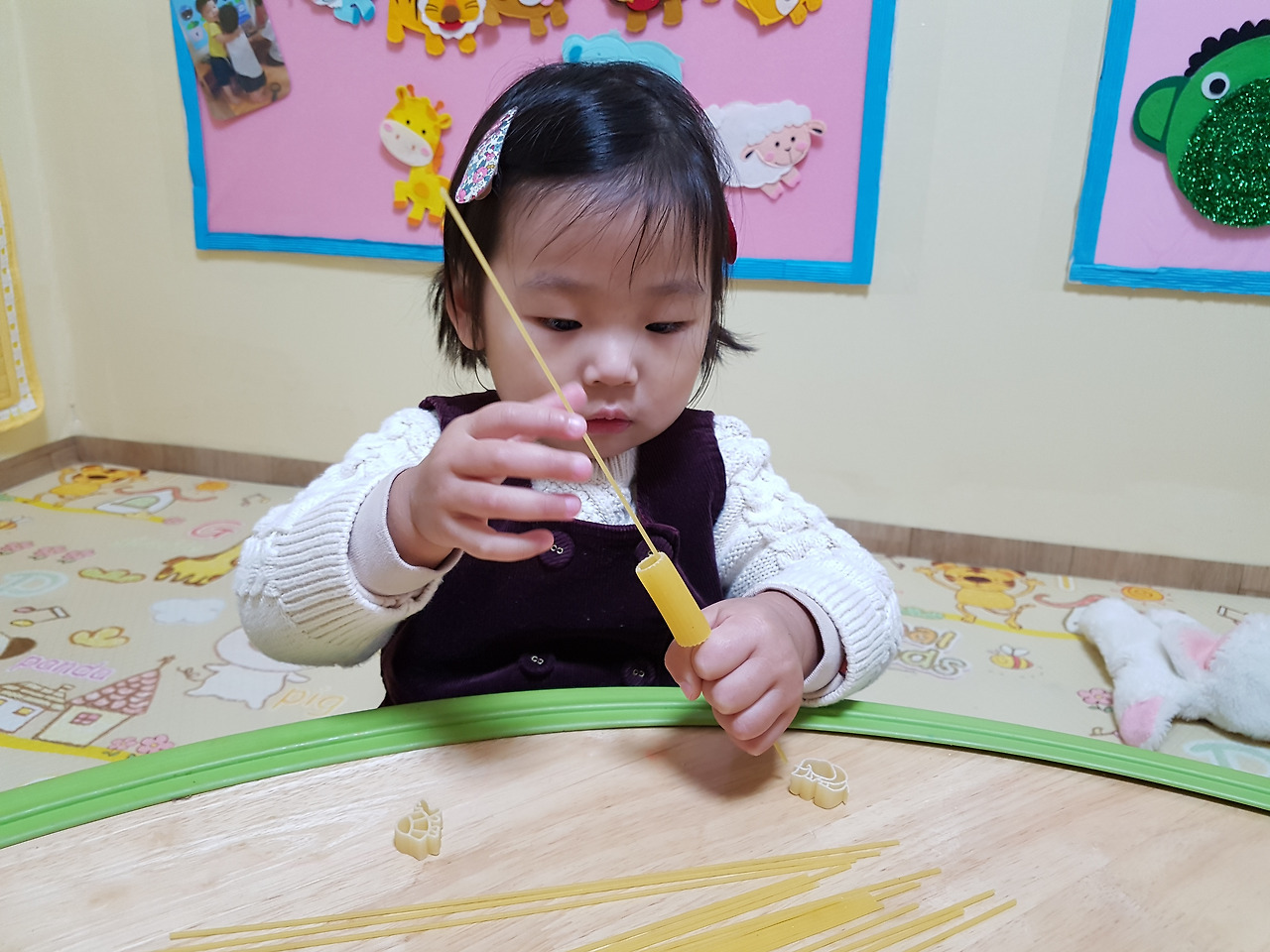 탐색이 끝났는지 긴 스파게티 면에 구멍 숭숭 뚫린 동물 파스타를 끼우기 시작합니다. 하나, 둘, 셋이라고 숫자를 세며 끼우기도 하고, 이거는 토끼, 오리, 하면서 모양을 설명하기도 합니다.