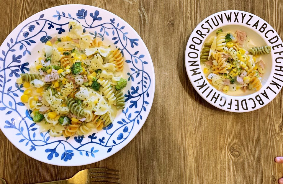 아이는 평소에도 파스타를 좋아하지만, 파스타 놀이를 한 후에 먹는 파스타는 꿀맛입니다. 맛있다고 엄지를 치켜세우며 '엄마 최고'를 외치면 그렇게 뿌듯할 수 없습니다. 양을 많이 한다고 했는데 아이가 평소보다 많이 먹어서 제 몫까지 덜어줬습니다. 이런 게 안 먹도 배부르다는 거였군요.