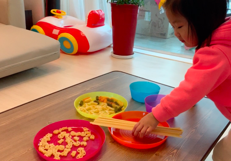 갖가지 파스타로 놀이상을 차려놓았습니다. 보자마자 자신의 놀잇감임을 눈치챈 딸아이가 달려가 스파게티를 한 움큼 집어 듭니다. 앞니로 딱딱한 면을 똑똑 끊어 먹기도 하고, 손으로 부러뜨리면서 관심을 보입니다.