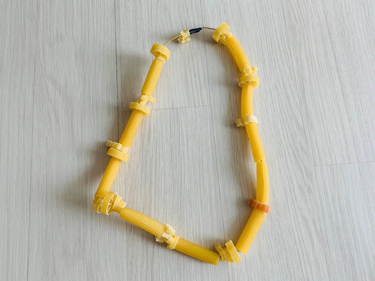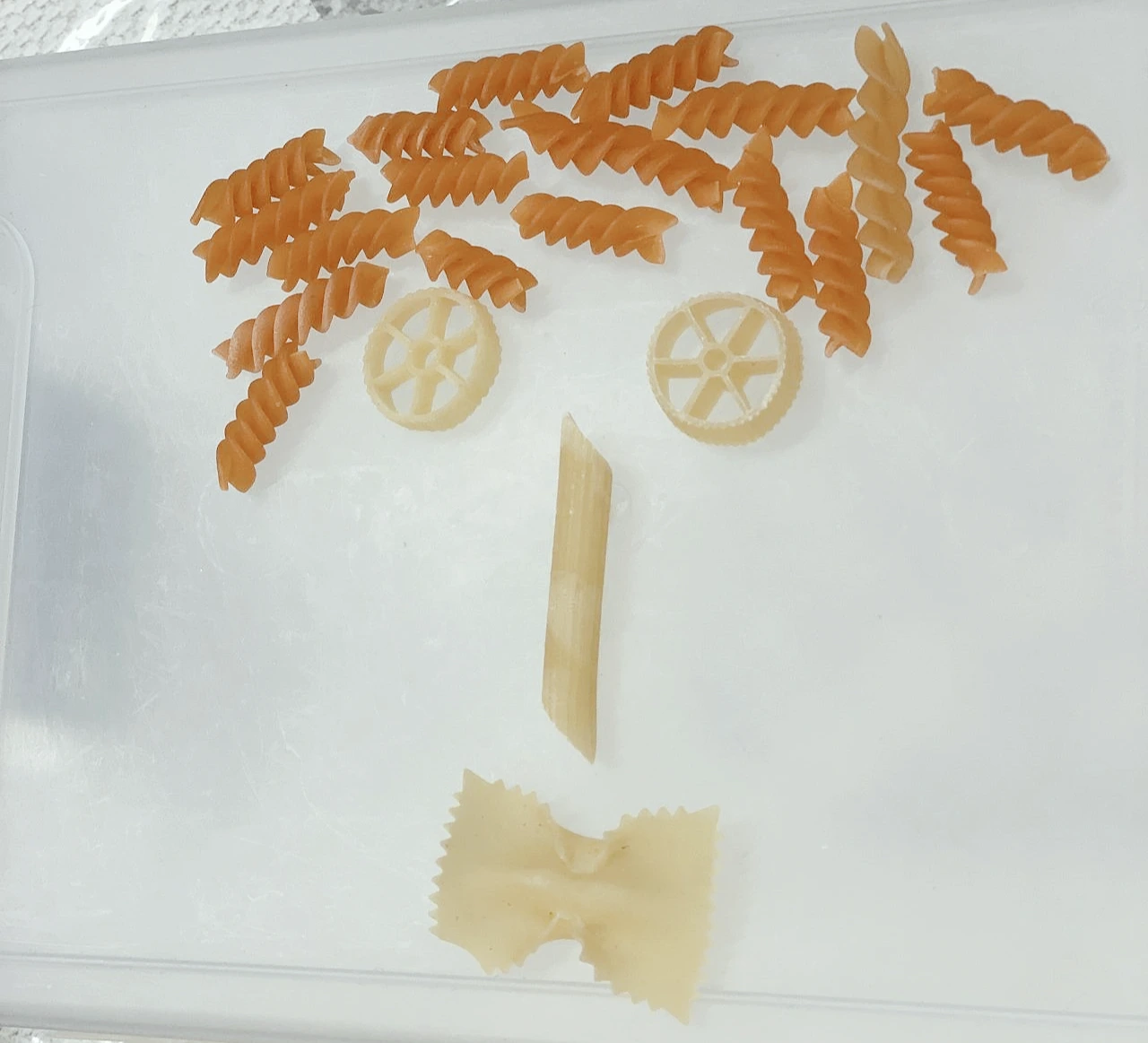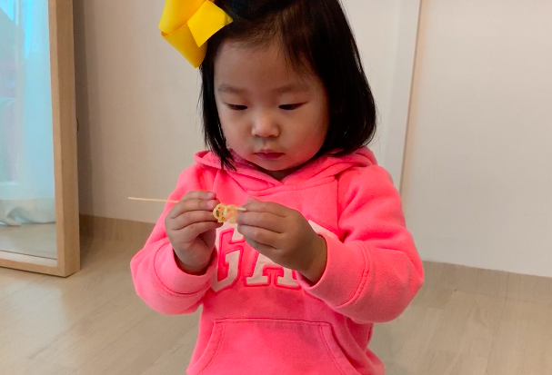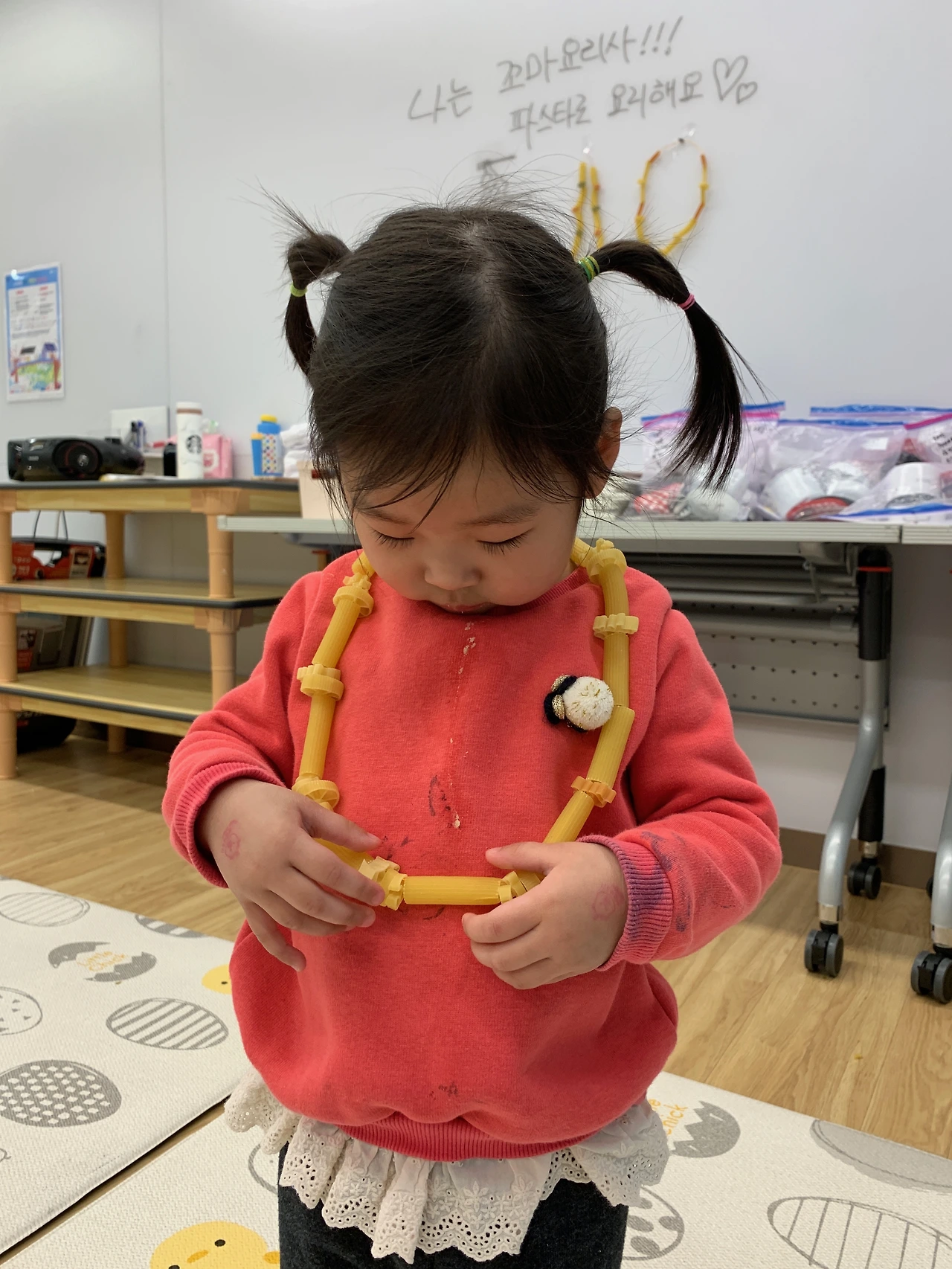 올봄부터 크레아트 미술놀이 문화센터를 다니는데 거기서도 파스타 놀이 시간이 있었습니다. 근래에 벌써 세 번째이다 보니 호기심이 동하지 않았는지 전만큼 활발하게 놀지는 않더라고요. 채유의 관심을 끌기 위해 다양한 파스타 면으로 사람 얼굴도 함께 만들어보고 낚싯줄을 이용해 파스타 목걸이도 만들었습니다. 선생님이 준비한 끈에 파스타를 끼워 넣는 활동에 흥미를 보이며 집중해서 했습니다.