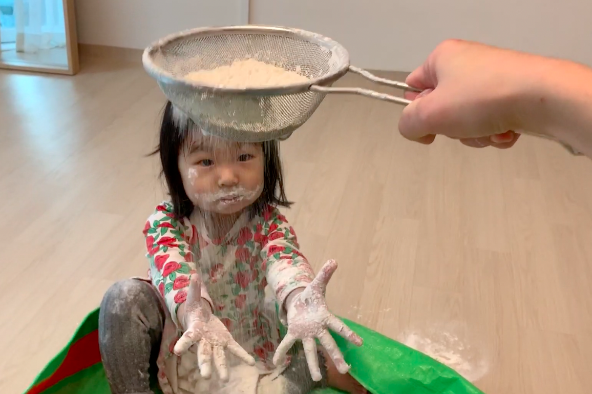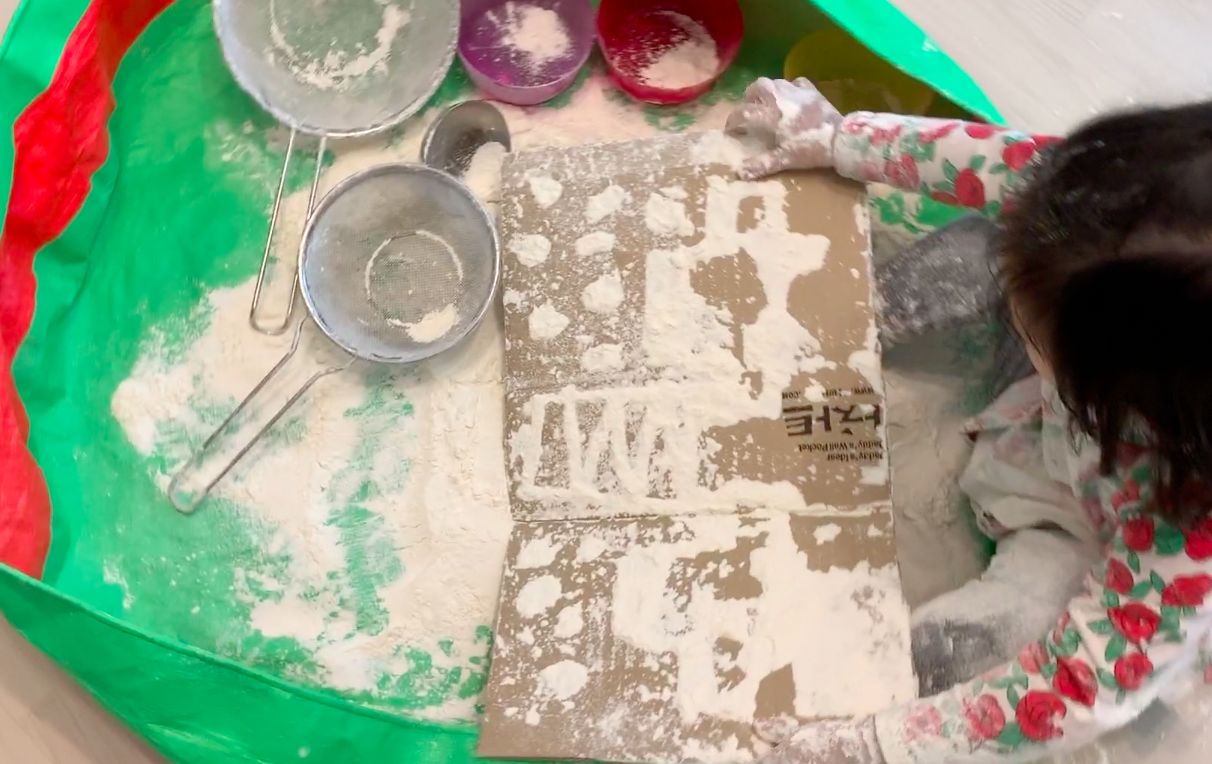 25개월 아기의 눈 경험을 확장시켜주고자 밀가루 놀이를 했어요