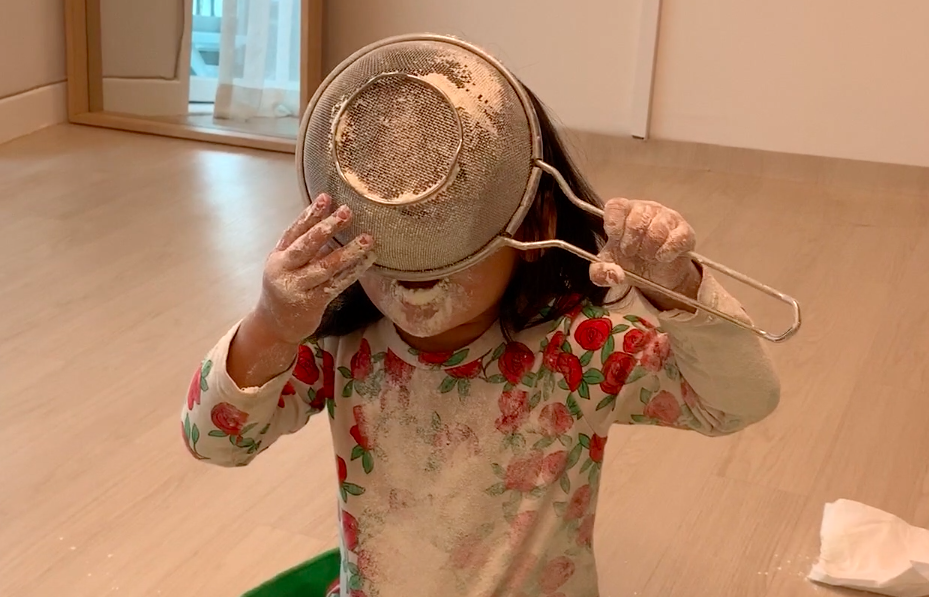 "채유야 이거봐, 오늘 아침에 하늘에서 눈이 내렸지? (체에 밀가루를 거르며) 하늘에서 밀가루 눈이 내려요~"