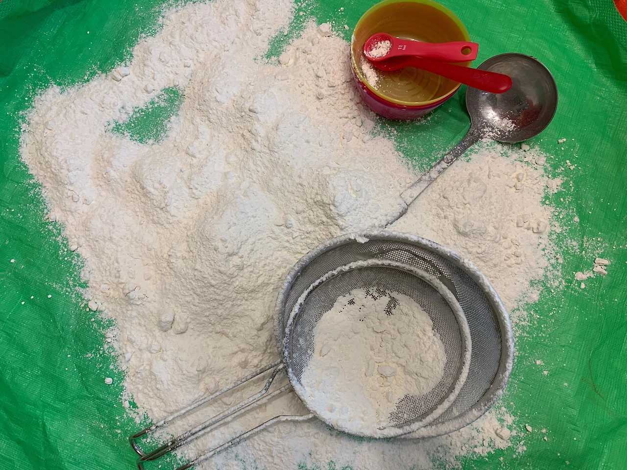 눈 놀이를 하려고 체도 두개나 준비하고 평소보다 많은 양의 밀가루를 사용했어요.