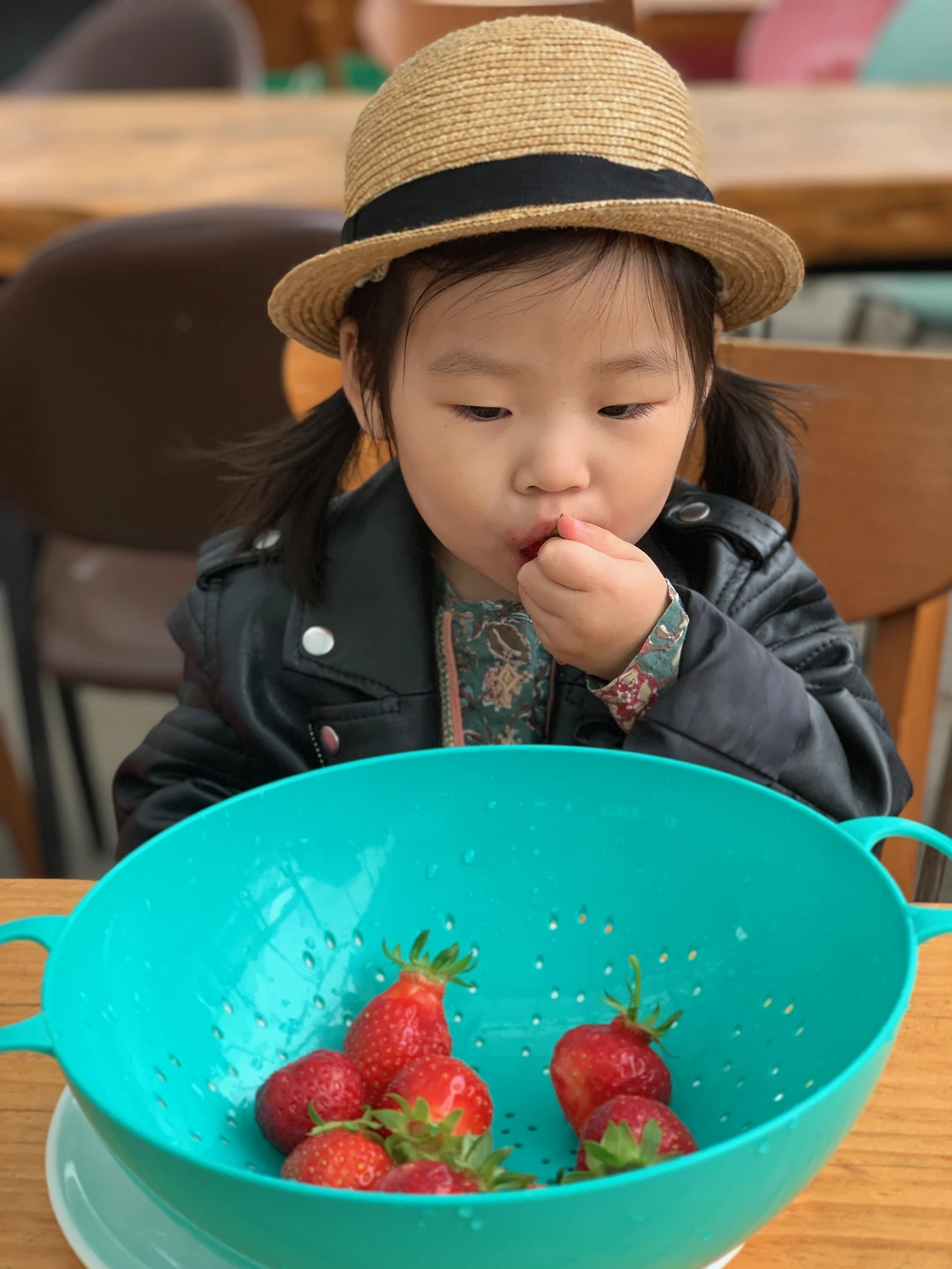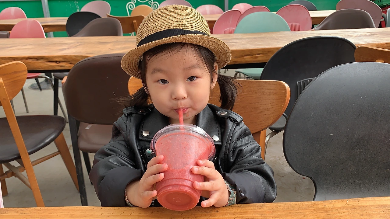 딸기를 두 팩에 가득가득 담은 것도 모자라 양 손 가득 딸기를 가져와서 씻어서 바로 먹습니다. 따자마자 바로 먹는 딸기 맛은 그야말로 꿀맛이지요. 유기농 딸기라고 합니다. 당도도 높고 신선한 딸기를 맛보는 채유는 딸기 맛에 폭 빠져버렸습니다. 걸쭉하게 간 딸기주스까지 모두 마셨습니다.