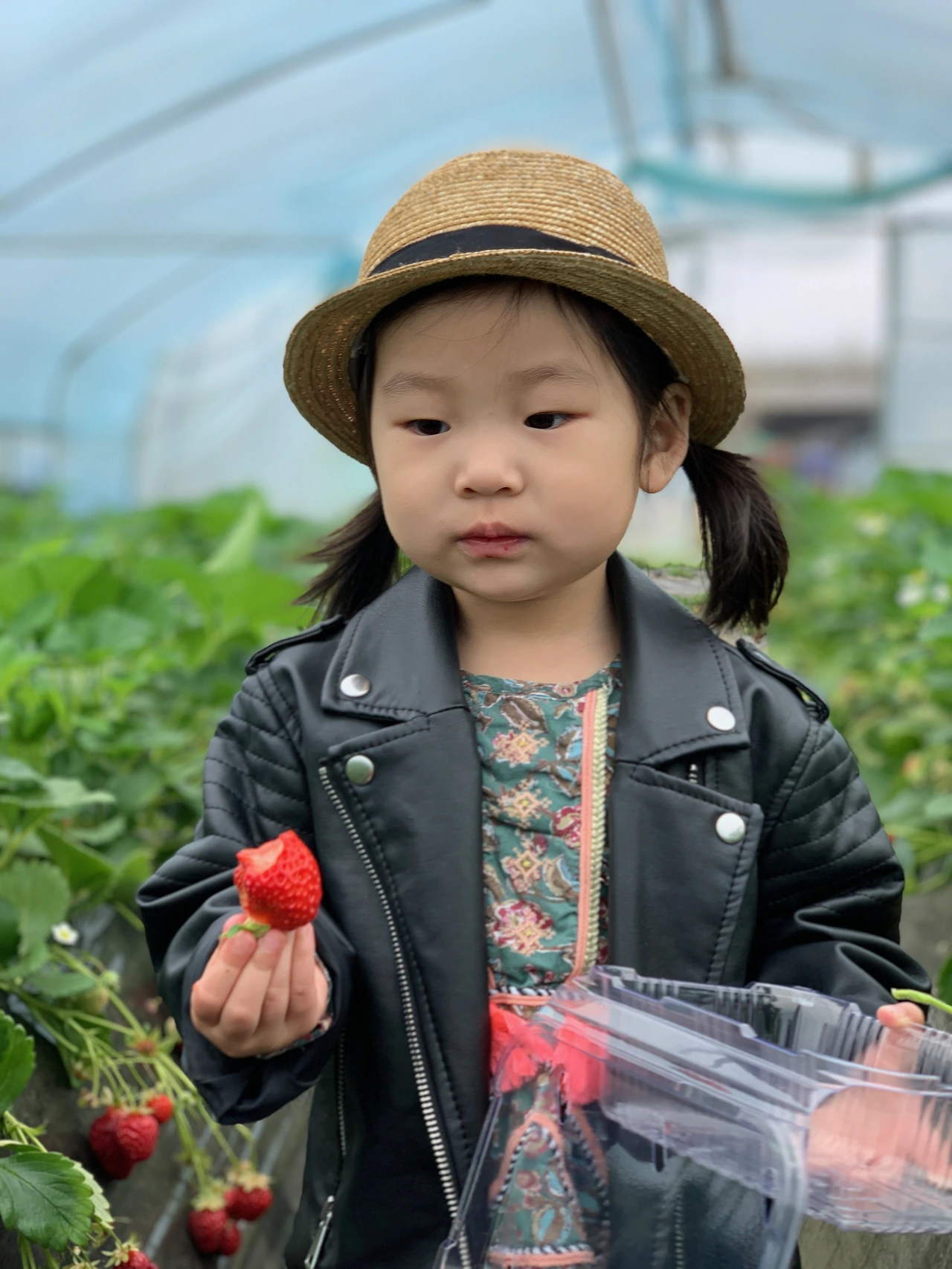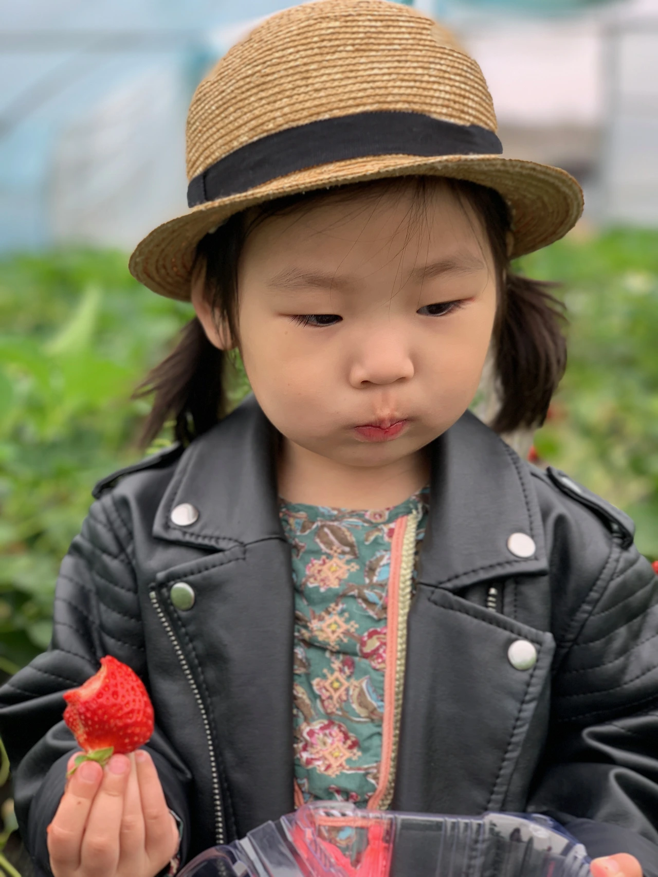 딸기 따서 통에 차곡차곡 쌓는 것을 좋아할 줄 알았는데, 딸기 먹는 재미에 폭 빠졌습니다. 먼지가 많아서 씻어서 먹자고 타일러도 "이거 씻어서 이따 먹자!" 하고는 앙~ 하고 깨물어버립니다. 언행불일치의 극치입니다. 그래서 채유의 딸기 통은 방금 온 듯 계속 비어있었습니다.
