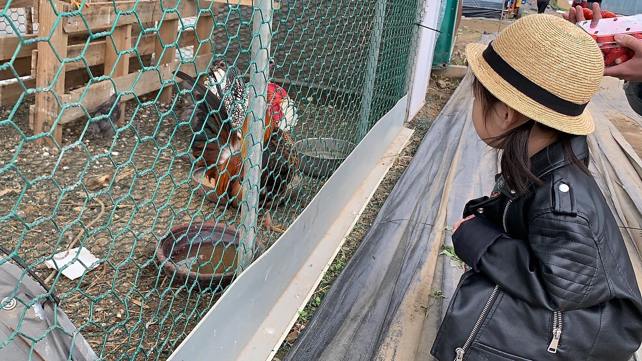 딸기 농장 가는 길에 닭, 돼지, 토끼우리가 있었어요. 동물을 좋아하는 채유는 여기에서도 한참 머물렀습니다. 닭 소리와 움직임도 관찰하고 직접 따온 딸기를 돼지에게 주기도 했어요. 채유가 돌이 지나서 걸을 수 있게 될 때쯤에 동물들에게 먹이를 줄 수 있는 동물농장도 종종 가곤 했었는데, 뜻밖의 장소에서 동물들을 만나니 더욱더 반갑게 느껴지는 모양입니다.