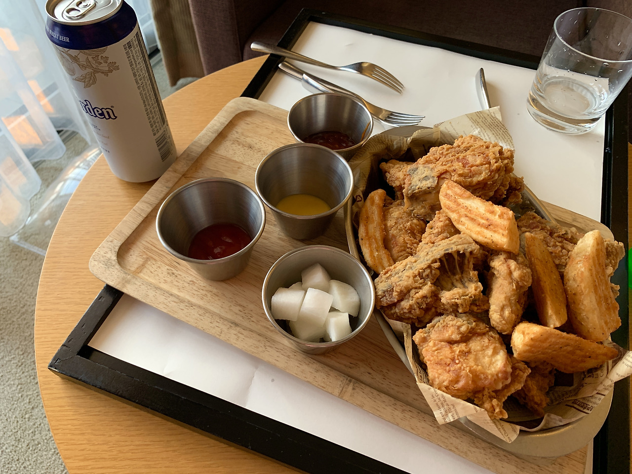 - 이 곳의 시그니처, 아이들 입맛에 딱 맞는 치킨 룸서비스 (배달한 치킨을 로비에 내려가 받아가는 번거로움이 없다)
