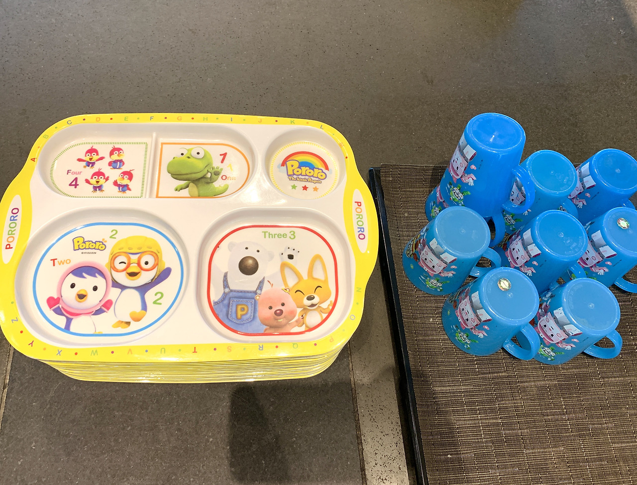 - 아이들이 선호하는 캐릭터 식판, 포크, 스푼 제공하고 아이들 위주의 메뉴가 많은 조식 뷔페