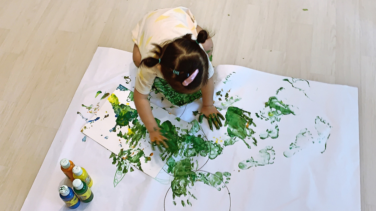 평소 같으면 이제 그만하겠다고 씻는다고 표현을 할 텐데, 흥이 올라왔는지 물감을 더 달라고 요청한다. 전지를 새로 하나 더 깔아줘야 하나.. 고민하는 새에 아이는 스스로 물감을 가져가서 짜고 손과 발에 묻힌다. 이미 온통 초록빛이다. 놀이에 집중하는 아이는 꼭 잔디밭에 앉아있는 것 같다.