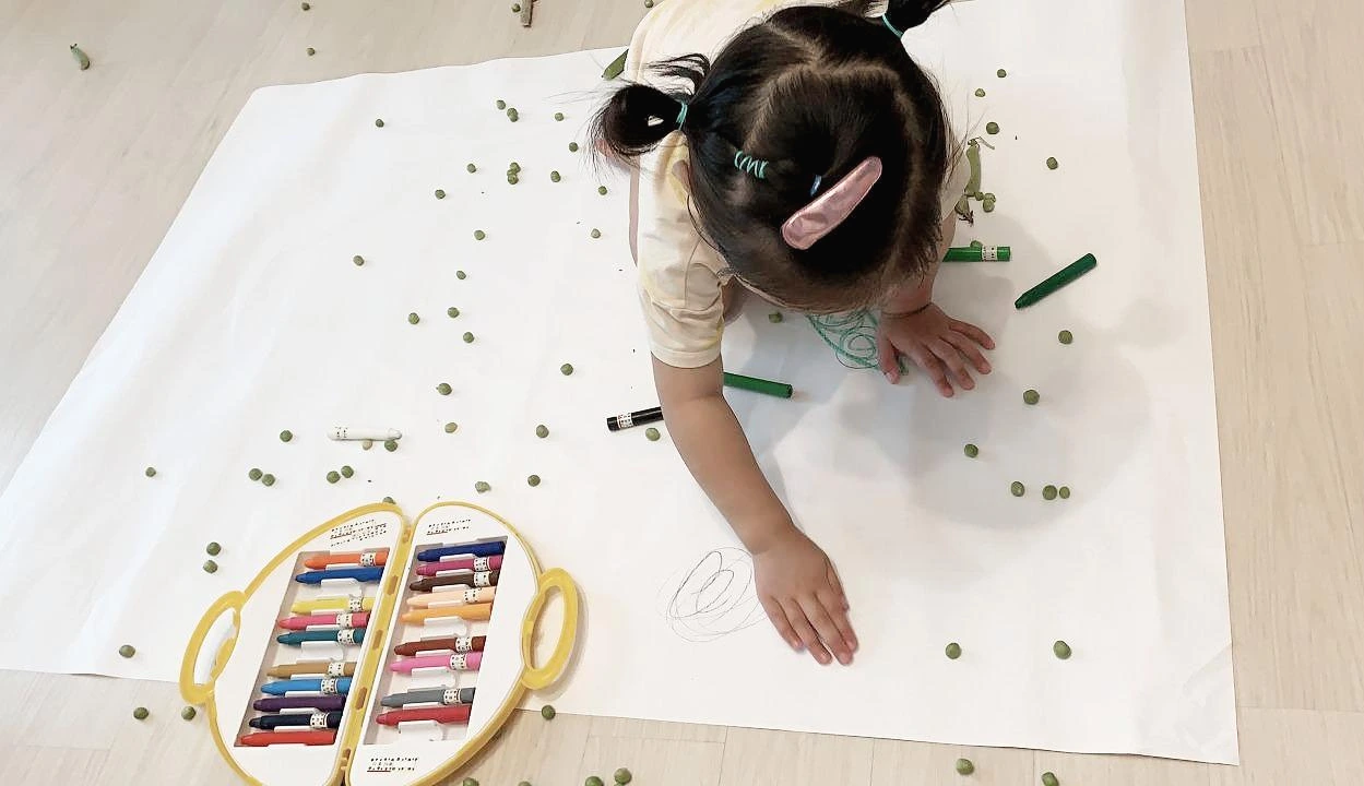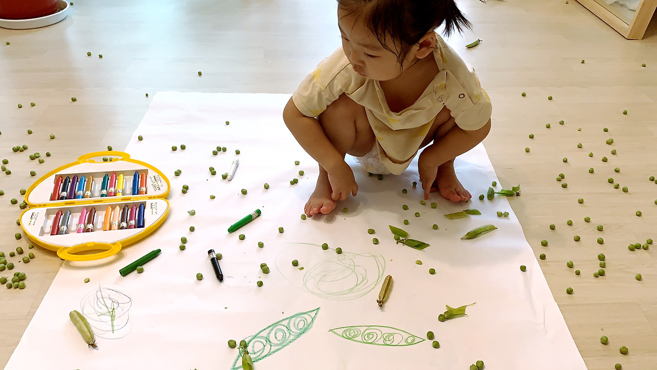 이제 막 완두콩 놀이에 흥미를 보인 아이의 흥을 깨뜨리고 싶지 않았다. 아이가 흩뿌린 완두콩을 엄마가 무릎으로 기어가며 정리한다면 아이는 자신이 뭔가 잘못한 것이라 생각할 터였다. 대신 크레파스를 하나 쥐어주고 관심을 돌려보기로 했다.