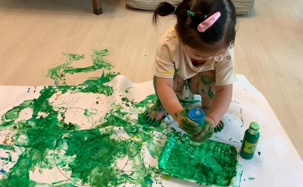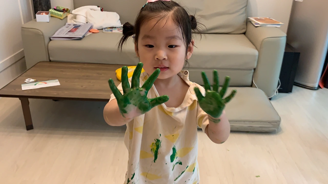 여름에는 나뭇잎들이 이렇게 선명한 초록색이 된다고 했더니 더 신나서 온 몸으로 표현한다. 물감놀이는 돌 이후부터 꾸준히 해왔지만 매번 할 때마다 아이는 도구를 사용하는 것보다 이렇게 자기 몸으로 물감을 묻히고 표현하는 것을 훨씬 더 즐긴다.