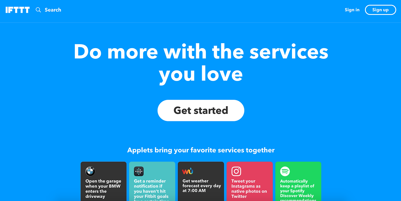 If this then That. 직역하자면 "만약 이거라면 저거 해" - 즉, 이러이러한 일이 발생하면 저러저러한 일을 하라고 조건을 줄 수 있는 플랫폼 서비스이다. 아마존 에코의 Alexa가 스마트홈 플랫폼으로 확고히 자리를 잡아가고 있기 때문에 대부분의 스마트 기기들이 아마존 플랫폼에 호환되기는 하지만, 아마존과 다른 진영의 서비스들이나 스마트폰을 제대로 활용하려면 iFTTT가 필요하다.