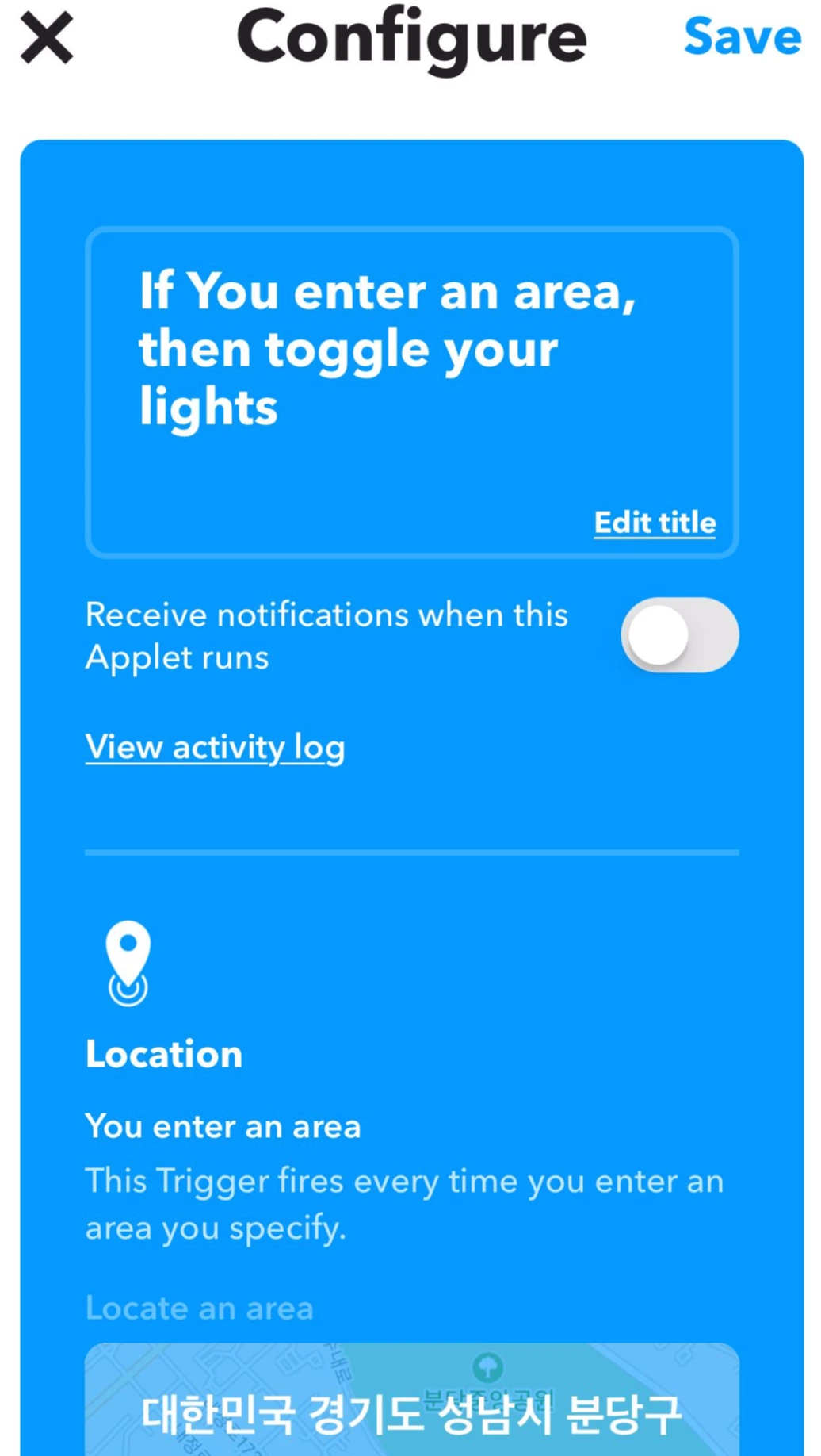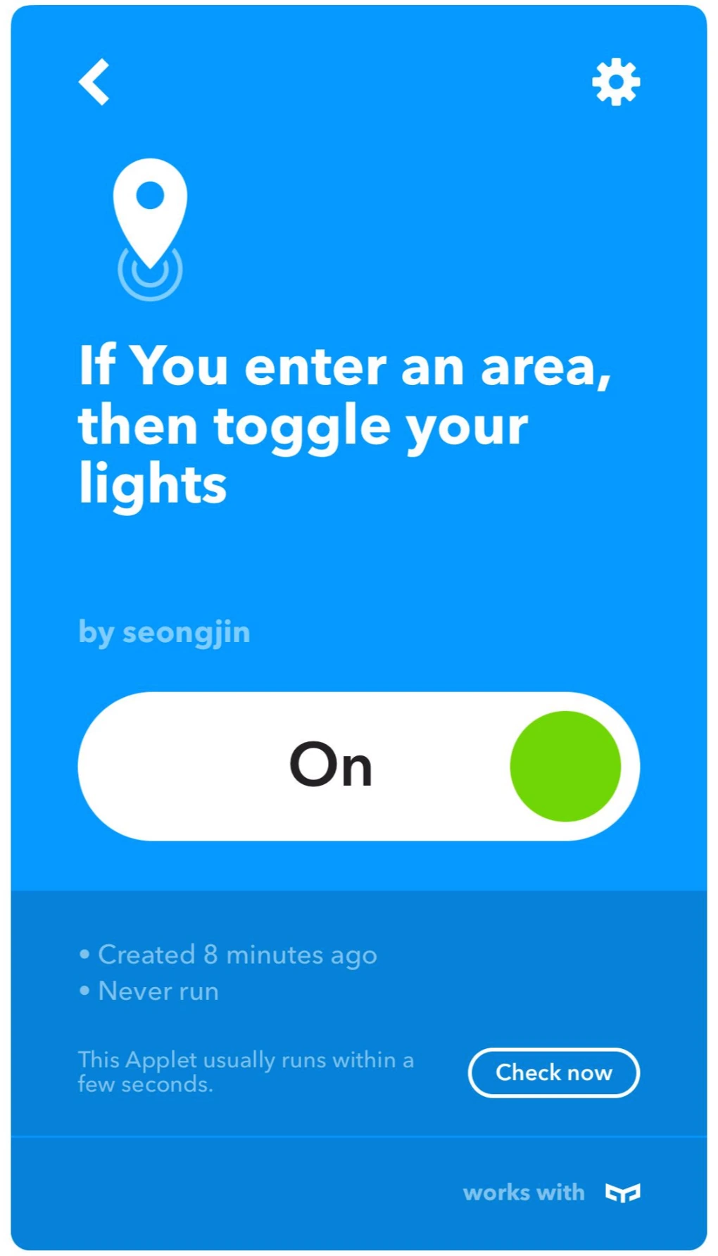 예를 들어, 스마트폰의 위치정보와 샤오미 스마트 전구를 연결할 수 있다. 나는 가족들이 집 위치에 들어서면 거실 등이 켜지도록 구성했다. 이 구성을 스마트폰의 IFTTT 앱에서 1분이면 만들 수 있다.